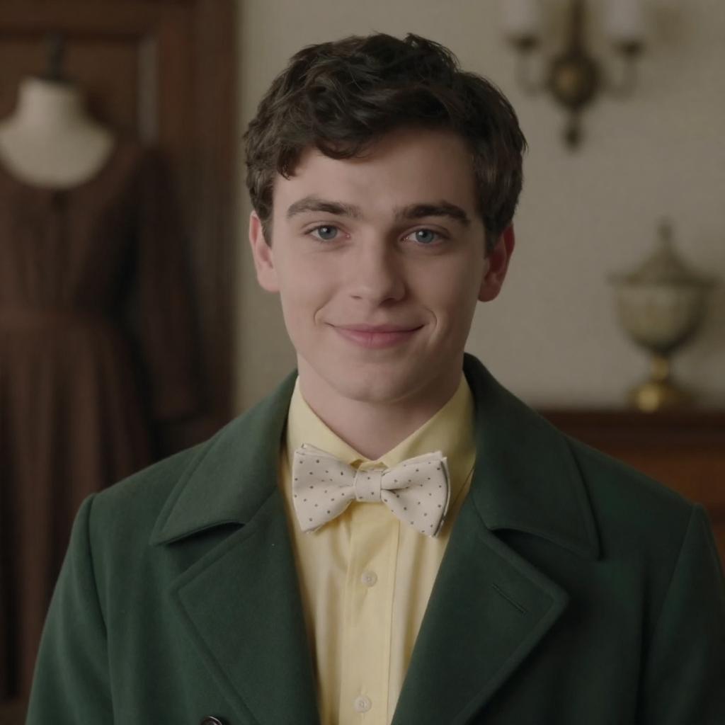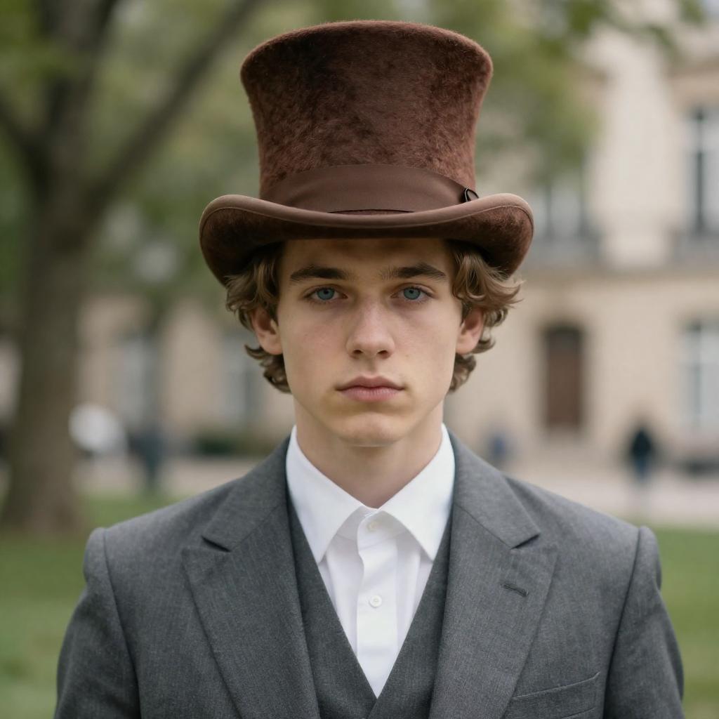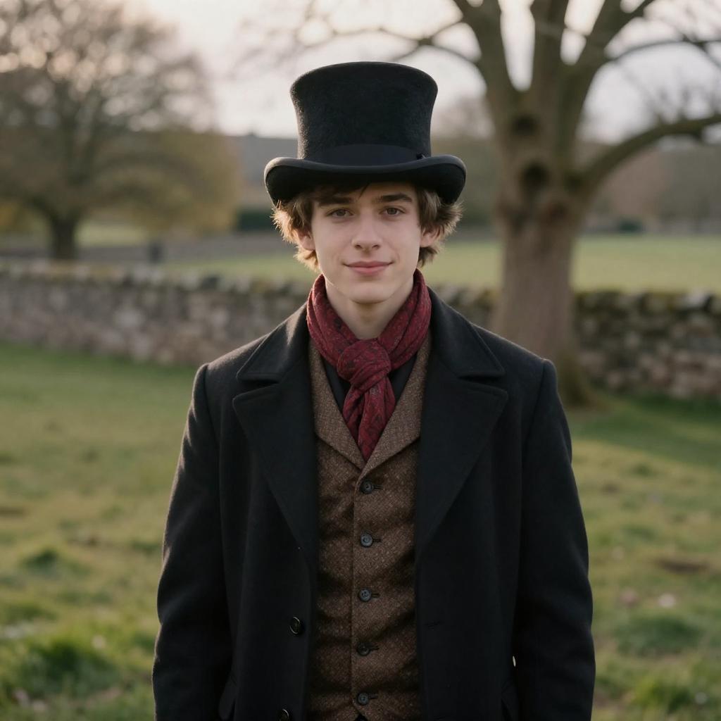 Photograph of a young man with fair skin and brown hair, wearing a black top hat, brown patterned waistcoat, black coat, and red patterned scarf. He stands in a grassy field with a stone wall and trees in the background, looking directly at the camera with a slight smile. Sunlight filters through the trees, casting a warm glow.
