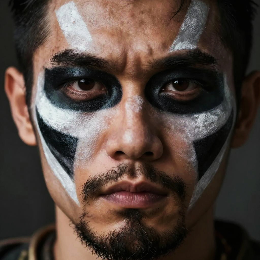 Close-up of a man with beard face paint resembling warrior markings, bold black and white geometric shapes accentuating the contours of the beard and jawline, intense gaze, high contrast lighting, cinematic and detailed portrait.