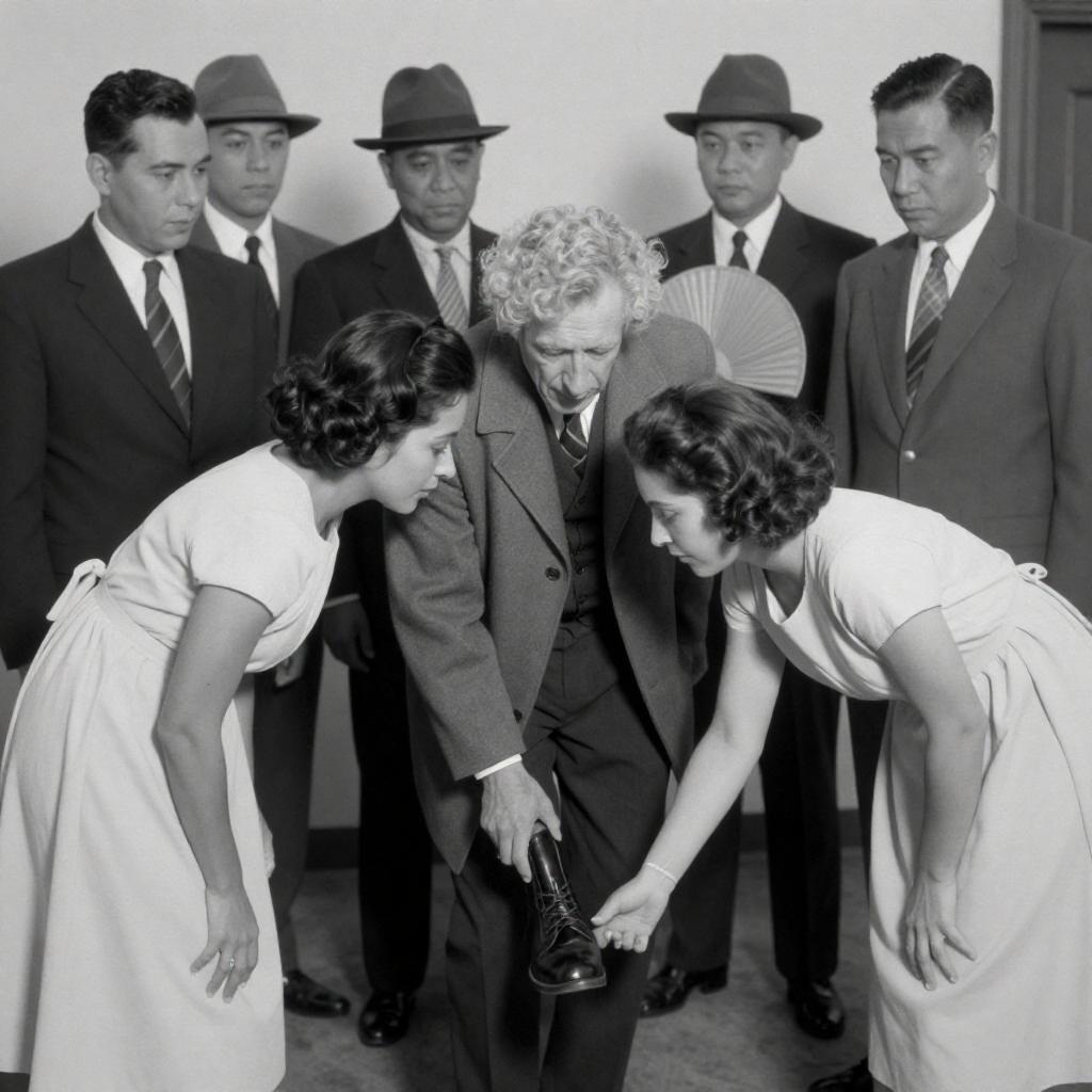 Black-and-white photograph of a group of eight people in a room. Central focus on an older man with curly hair, wearing a coat, being helped by a woman in a dress. Another woman bends over, adjusting his shoe. Men in suits and hats stand behind. One man in the background holds a fan. Women in the foreground wear light dresses. Intense expressions on faces. Group dynamics, clothing ures, and casual interaction.