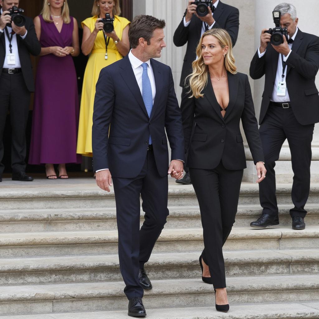 Photograph of a formal event. A woman with blonde hair in an updo, wearing a white dress with a square neckline, stands beside a man in a black tuxedo with a bow tie. Both have serious expressions. Background includes other guests in formal attire, a floral arrangement, and a painting on the wall. The man looks at the woman while she looks forward. The scene is well-lit and indoor.