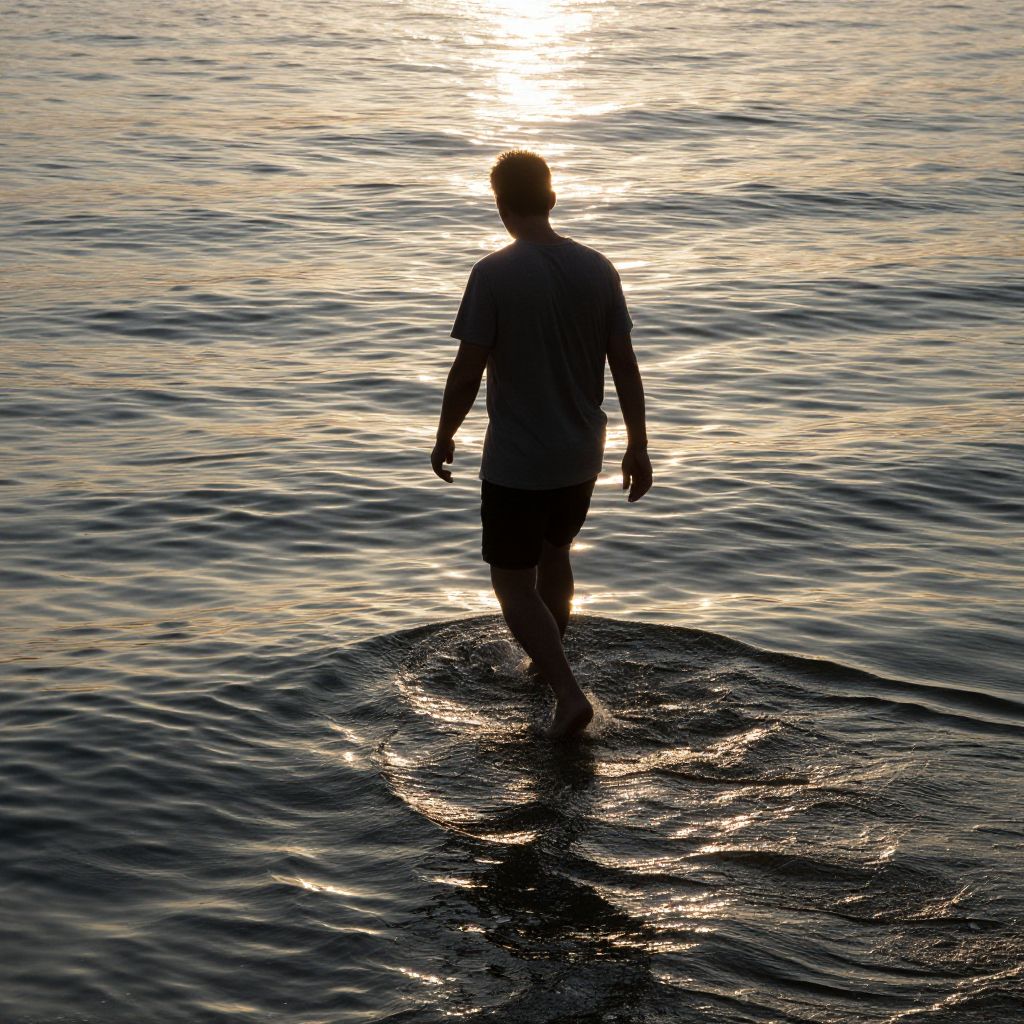 A man walks on water’s surface unblemished by footprints, creating ripples that shimmer with memories nearly forgotten.