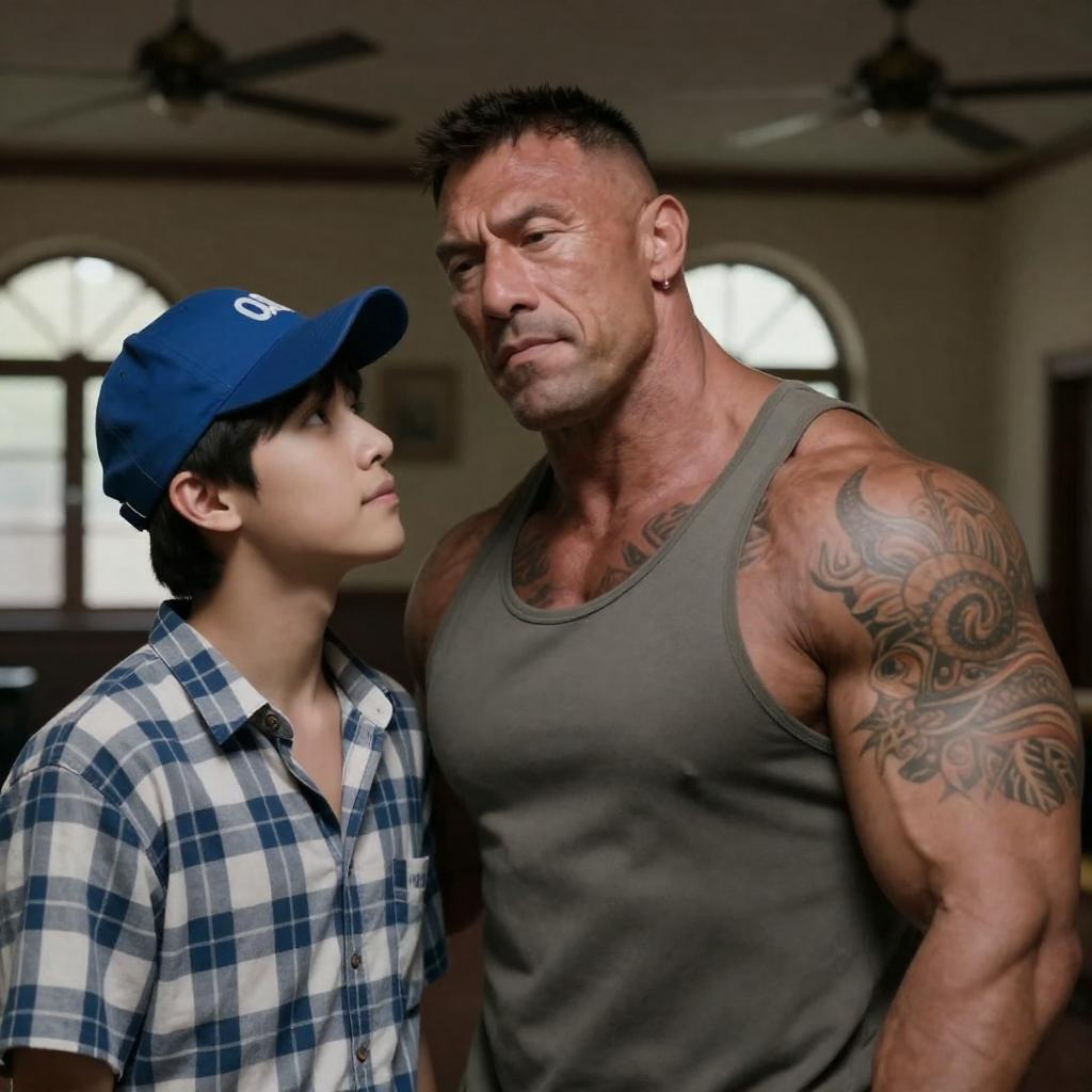 Photograph of a muscular, tattooed man with a large, defined chest and arm tattoos, wearing a sleeveless shirt, standing close to a young man in a checkered shirt and blue cap. The young man looks up at the tattooed man with a mix of awe and admiration. Background includes a dimly lit room with arched windows and ceiling fans.