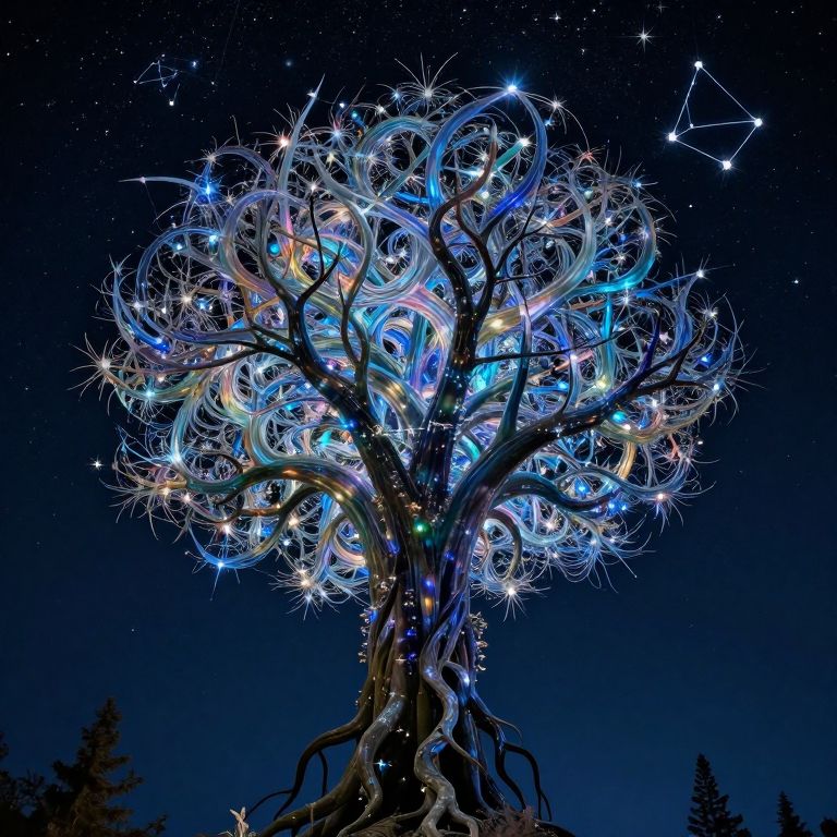 Glowing, intricately twisted tree adorned with multicolored lights against a starry night sky, with constellations visible in the background.