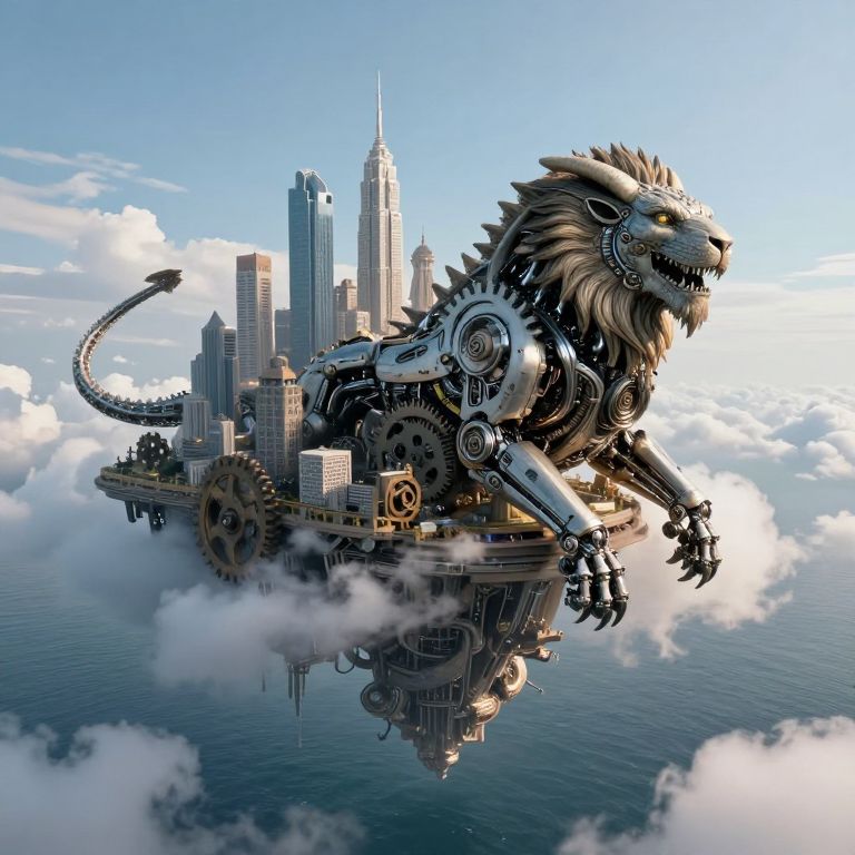 Digital artwork: Mechanical lion with gears and metal fur, standing on floating cityscape with skyscrapers, surrounded by clouds, against a bright blue sky