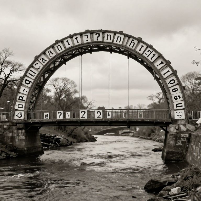 A bridge made entirely of forgotten questions arches over a river of unresolved debates, pulsing softly with curiosity.