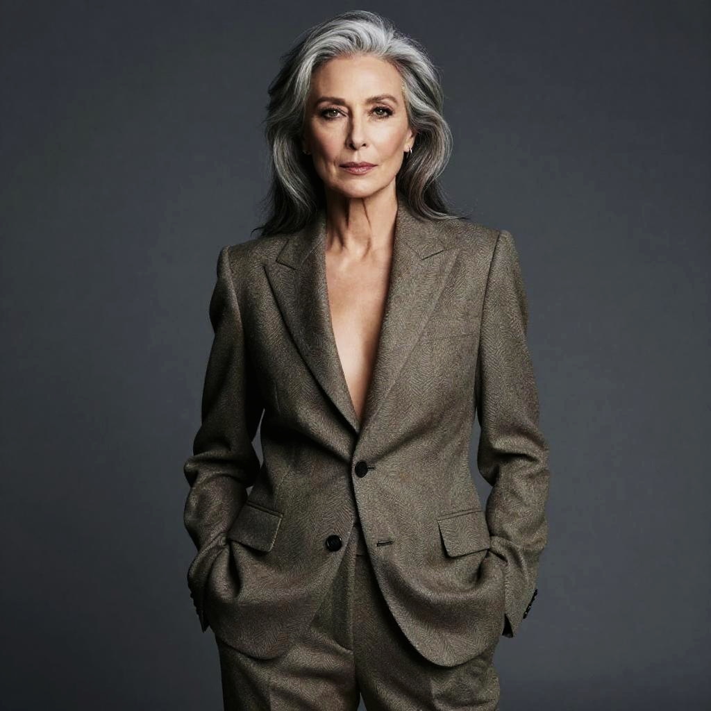 Photograph of a mature woman with blonde, wavy hair, wearing a beige, textured, buttoned cardigan, smiling subtly against a dark blue