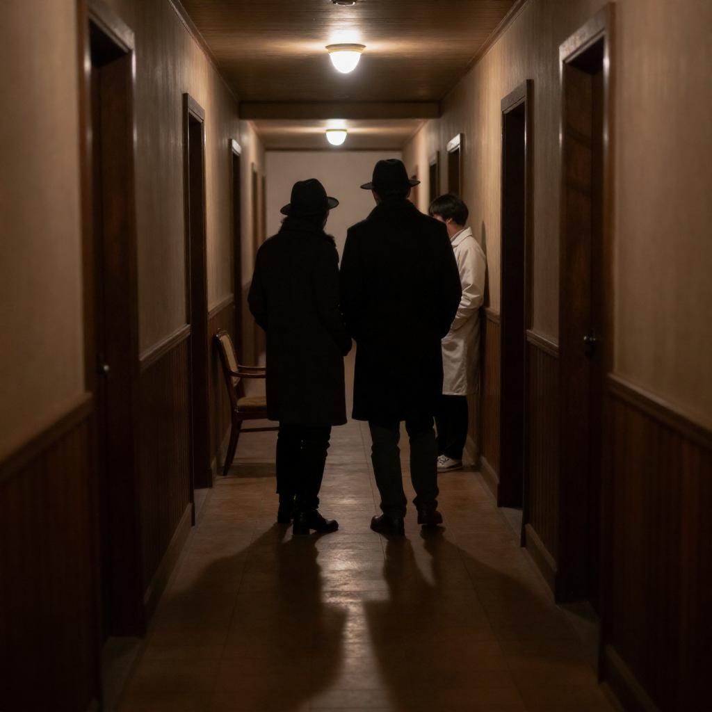 Photograph of a dimly lit, narrow, wooden hallway with tiled floors. Two people in dark coats and hats stand close together near the center, while a third person in white stands further back. Overhead lights cast a warm glow, and a vintage chair is visible in the background.