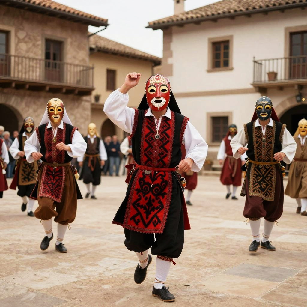 Traditional pentaculo dancers performing in rustic medieval town square, elaborate masks and clothing with red and black patterns, energetic poses, historical architecture backdrop, warm natural lighting, capturing rich cultural heritage and ancient traditions in detailed realism