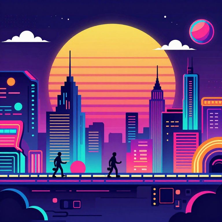Retro cyberpunk, futurism, arcade game style, illustration, vector, bright vapor wave, city scape side scroller,