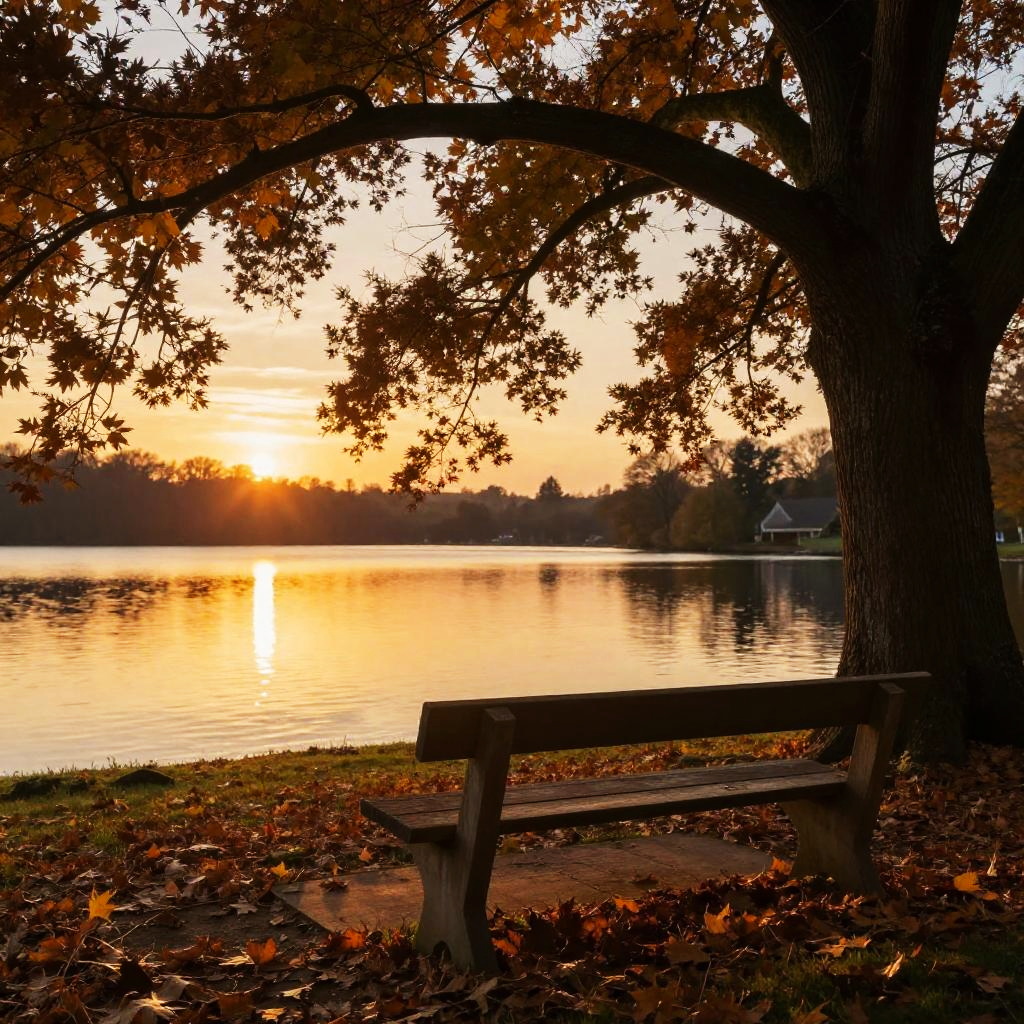 Beside a serene lake at sunset, a wooden bench stands under a large oak tree, autumn leaves scattered around, soft golden light reflecting off the water, peaceful countryside scene, realistic style, warm colors.