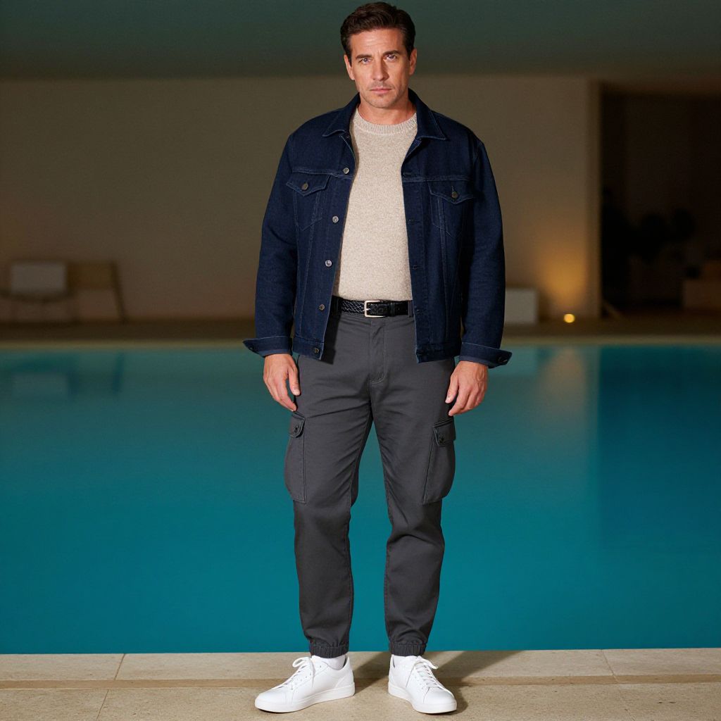 A man, charcoal gray tapered cargo pants, oversized navy denim jacket, soft beige knit sweater, classic white low-top sneakers, textured black leather belt, indoor infinity pool, soft ambient lighting, pinhole camera style, relaxed expression. Man has masculine face and piercing eyes