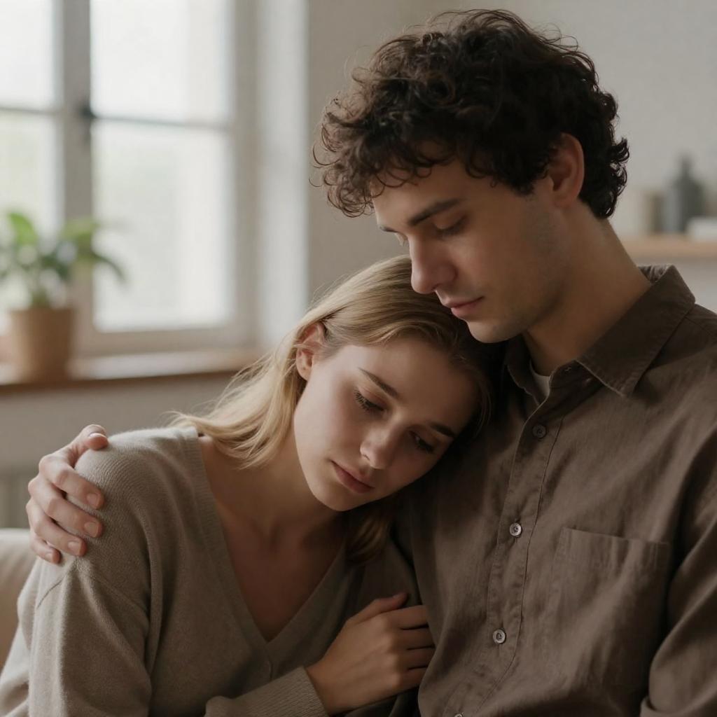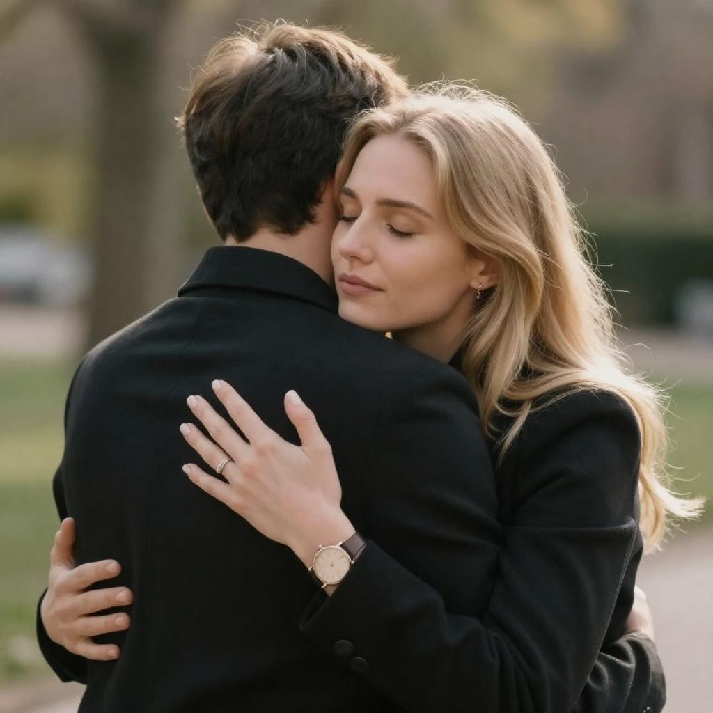 Photograph of a tender embrace between a blonde woman with fair skin and a dark-haired man. Both wear black jackets; the woman's hair is loose, and she wears a watch. They stand outdoors with blurred greenery and sunlight in the background. The woman's eyes are closed, and her hand rests on the man's back.