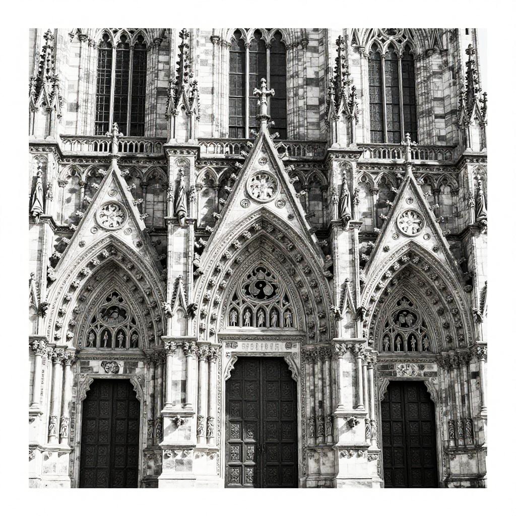 Cathedral tattoo designs emphasizing the grandeur of large arched doorways and spires, combined with gothic elements like gargoyles and vaulted ceilings, created with high contrast black ink and intricate dot work for texture.