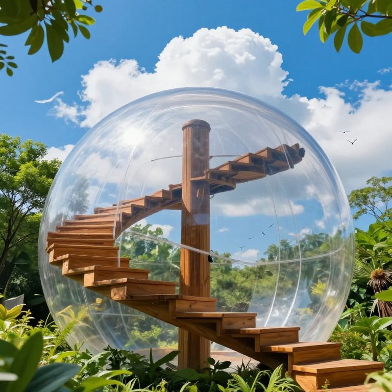 A digital artwork depicts a wooden spiral staircase encased in a large, transparent glass dome. The staircase, with its warm brown hues and geometric steps, winds upward through the center of the dome. The background features a vibrant blue sky with fluffy white clouds and lush green foliage, including trees and bushes, surrounding the dome. Sunlight filters through the glass, creating reflections and highlights. The overall scene blends natural and architectural elements, highlighting the contrast between the wooden staircase and the clear, modern dome, set in a serene, forested environment.