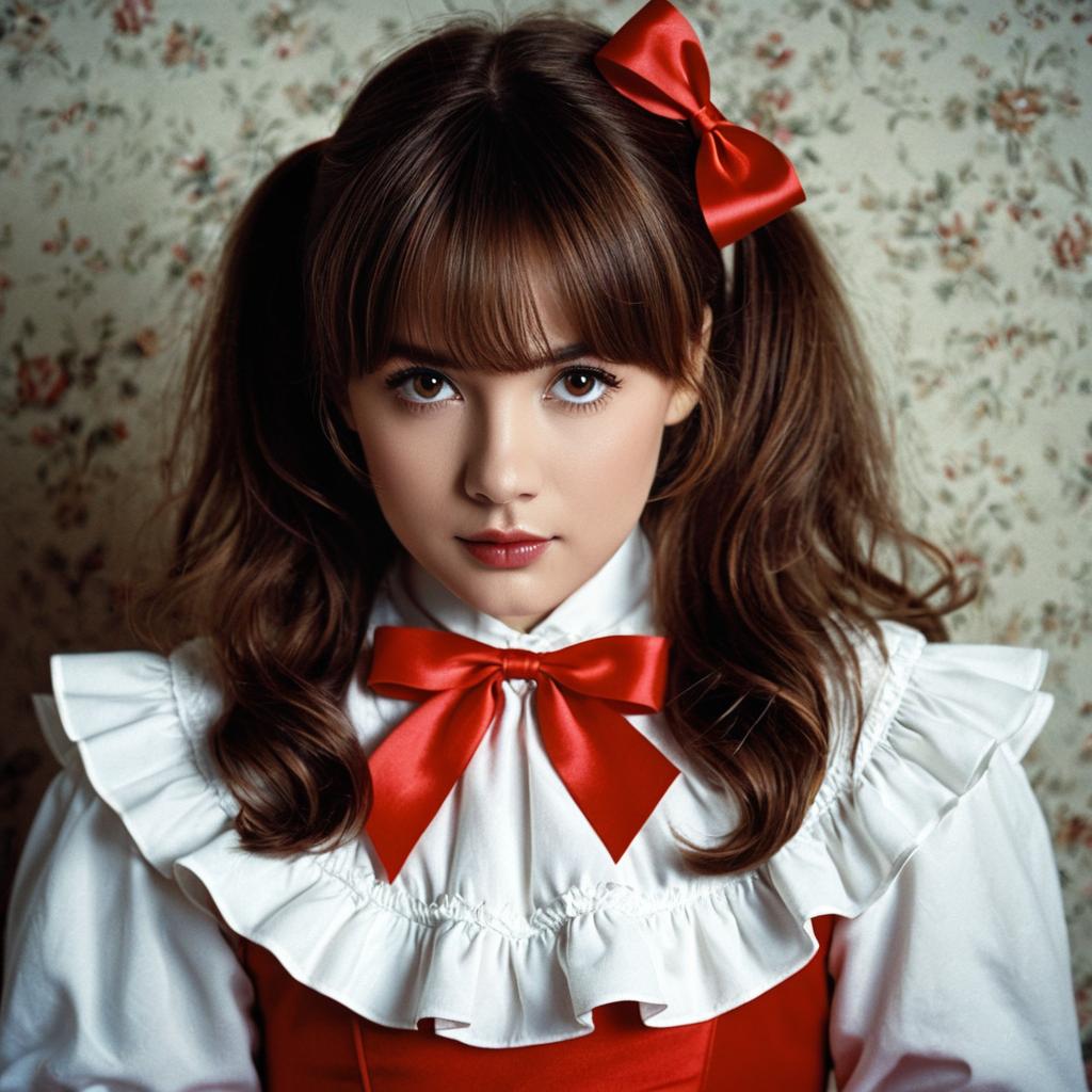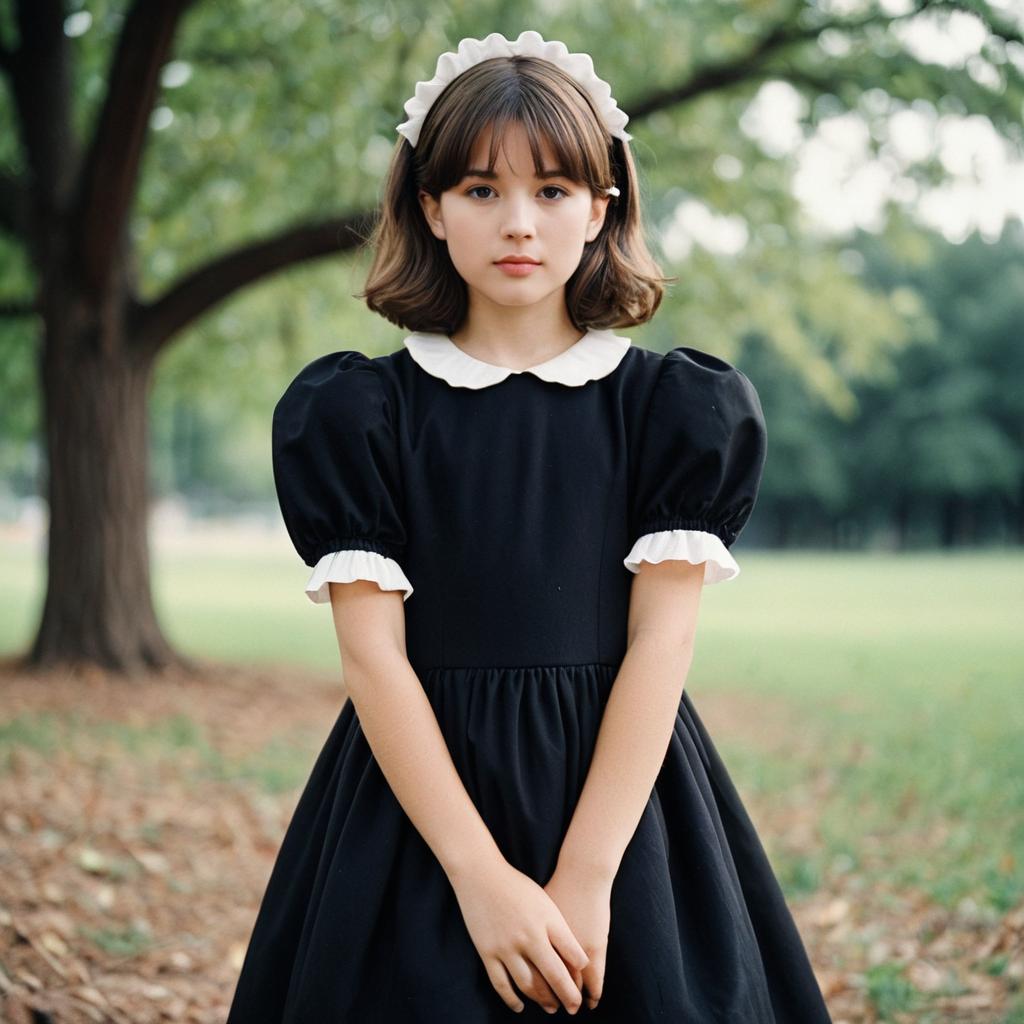 Portrait of a young girl with brown hair wearing a black dress with white collar and cuffs, featuring puffy short sleeves. She stands outdoors in a park setting with trees and blurred background, looking directly at the camera with a neutral expression. The girl wears a white ruffled headband and has her arms relaxed at her sides.