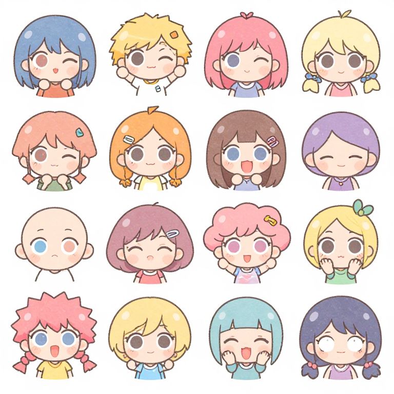This is a digital drawing in a chibi anime style featuring sixteen cartoon characters arranged in a 4x4 grid. Each character has large, expressive eyes, small mouths, and rounded features. They have various hair colors and styles, including blue, pink, blonde, orange, brown, purple, and black. The characters display a range of emotions, such as smiling, winking, and blushing. They wear simple, colorful clothing, and some have hair accessories like hairpins and bows. The background is plain white, emphasizing the characters. The overall style is cute and playful, with bright colors and a whimsical feel.