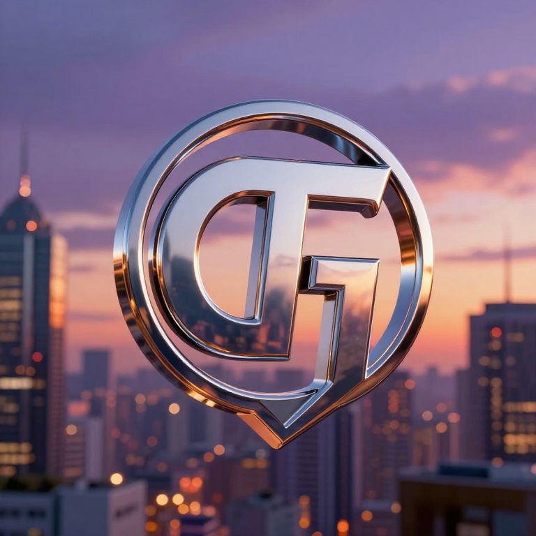 Gtalogo designed as a sleek 3D metallic emblem floating above a futuristic city skyline at dusk, reflective chrome surfaces with warm orange and purple lighting, cinematic depth of field and sharp details