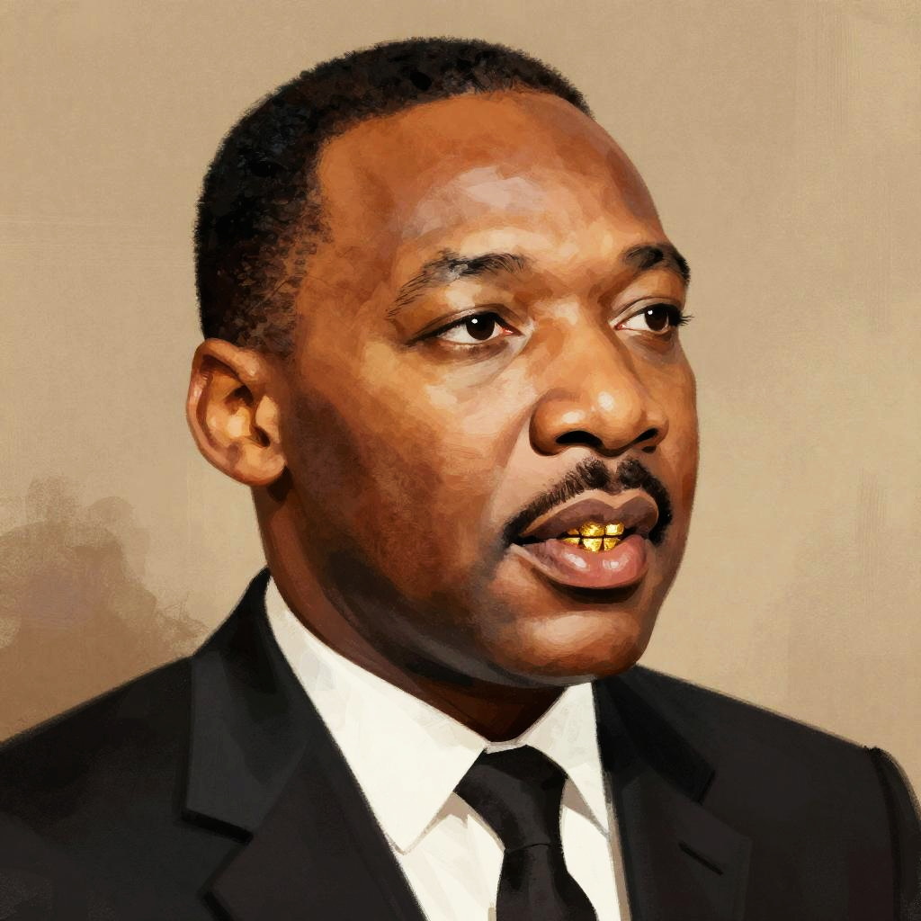 Portrait of MLK gold teeth captured in a vintage-inspired illustration, warm sepia tones and textured brush strokes, showing him in thoughtful repose with subtle golden gleam on his teeth, blending historical reverence with artistic flair
