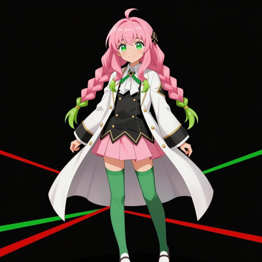Digital illustration of a pink-haired anime girl with green eyes and freckles. She wears a white coat over a black outfit with green thigh-high stockings, pink skirt, and white shoes. Her hair is in twin braids with green ends. She has a confident smile, green eyes looking forward. Black background with red and green lines in the foreground.
