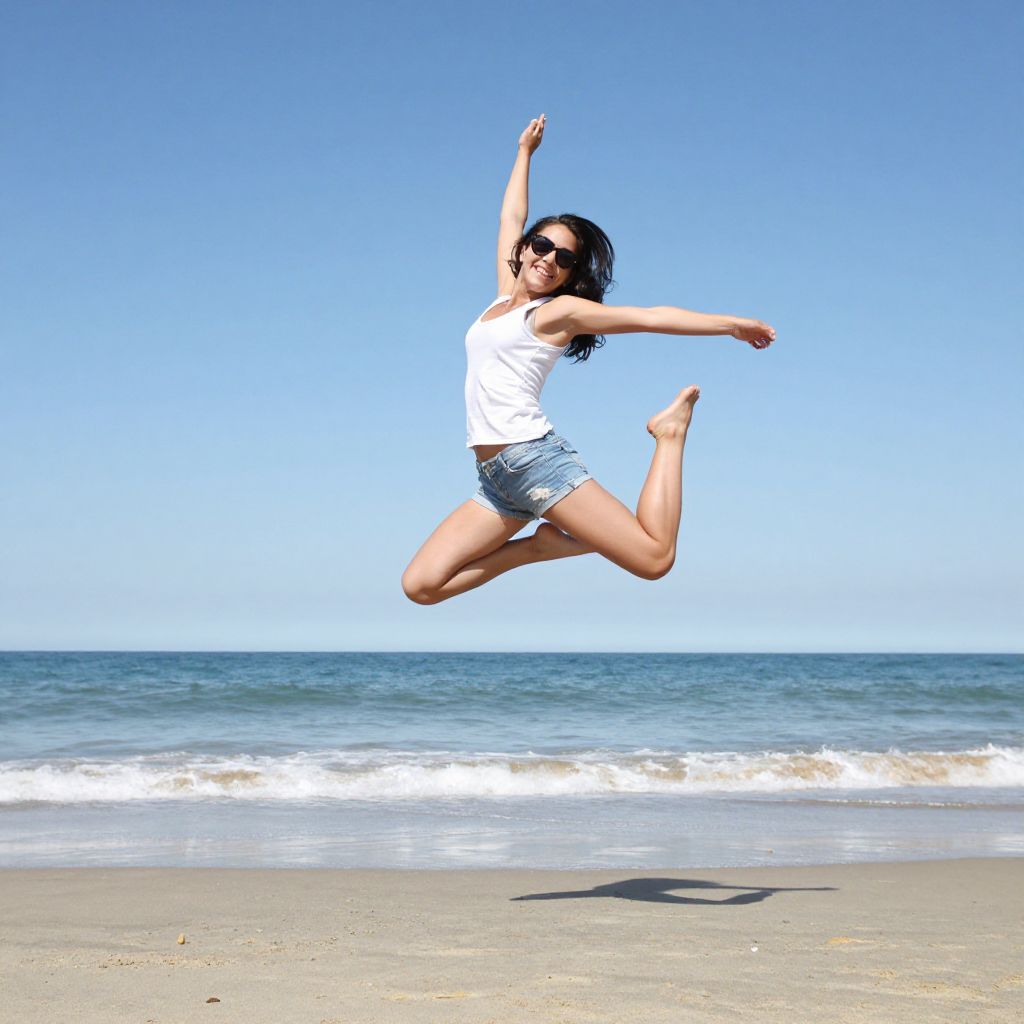Photograph of a woman with curly black hair, white tank top, and denim shorts, jumping joyfully on a sandy beach with waves crashing in the