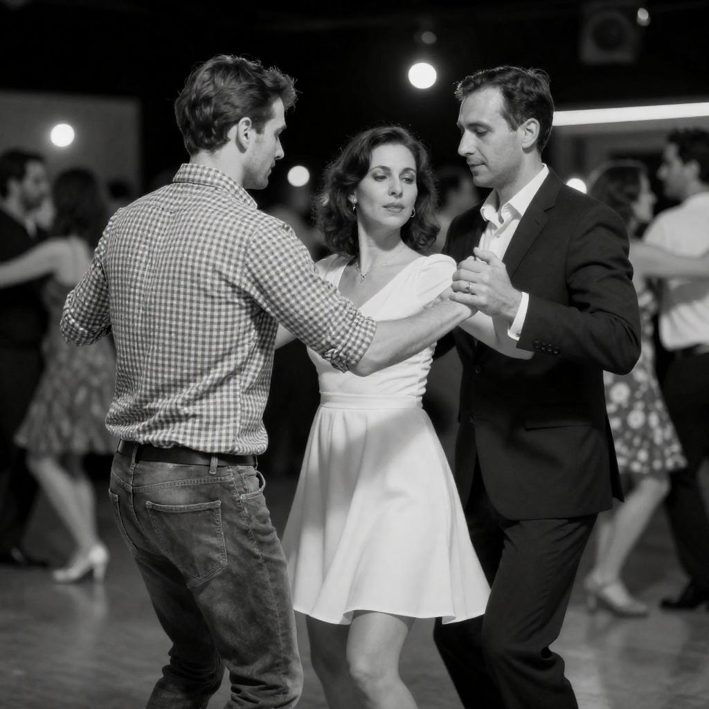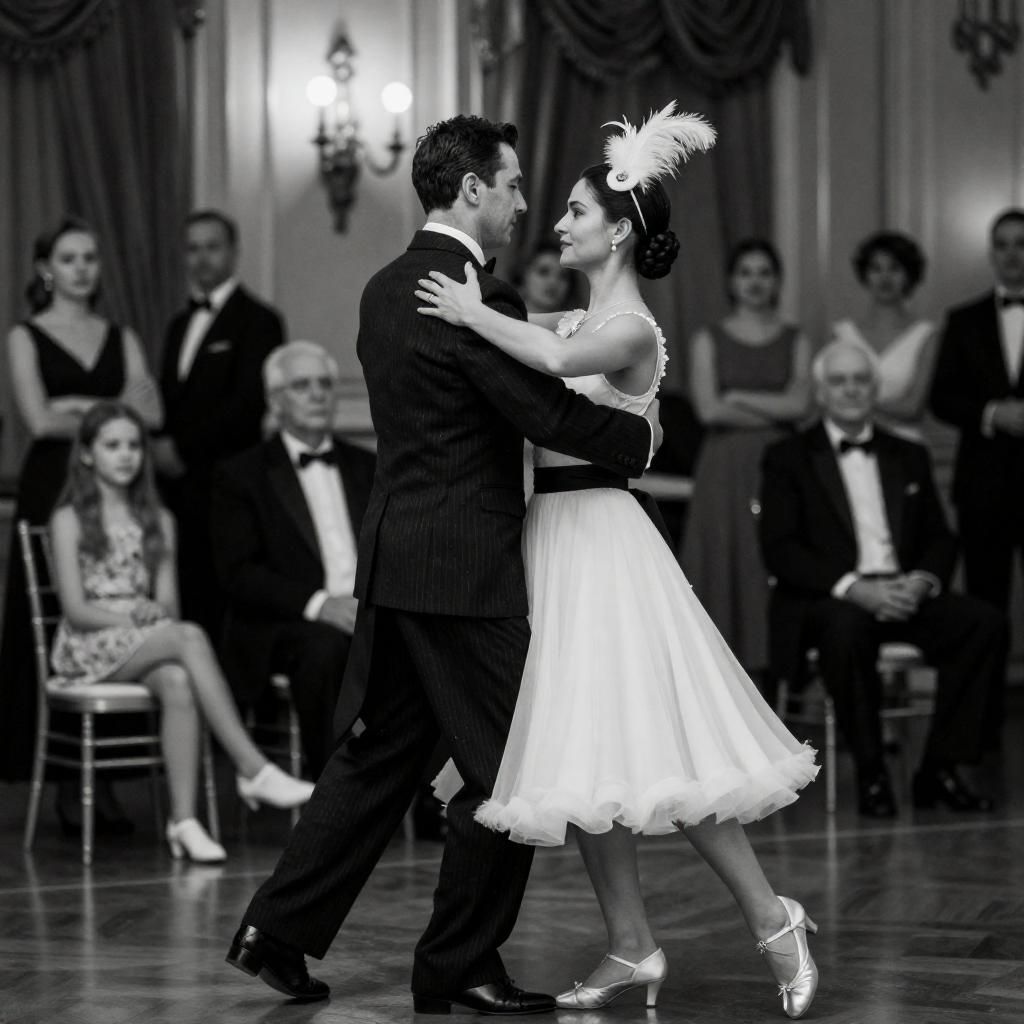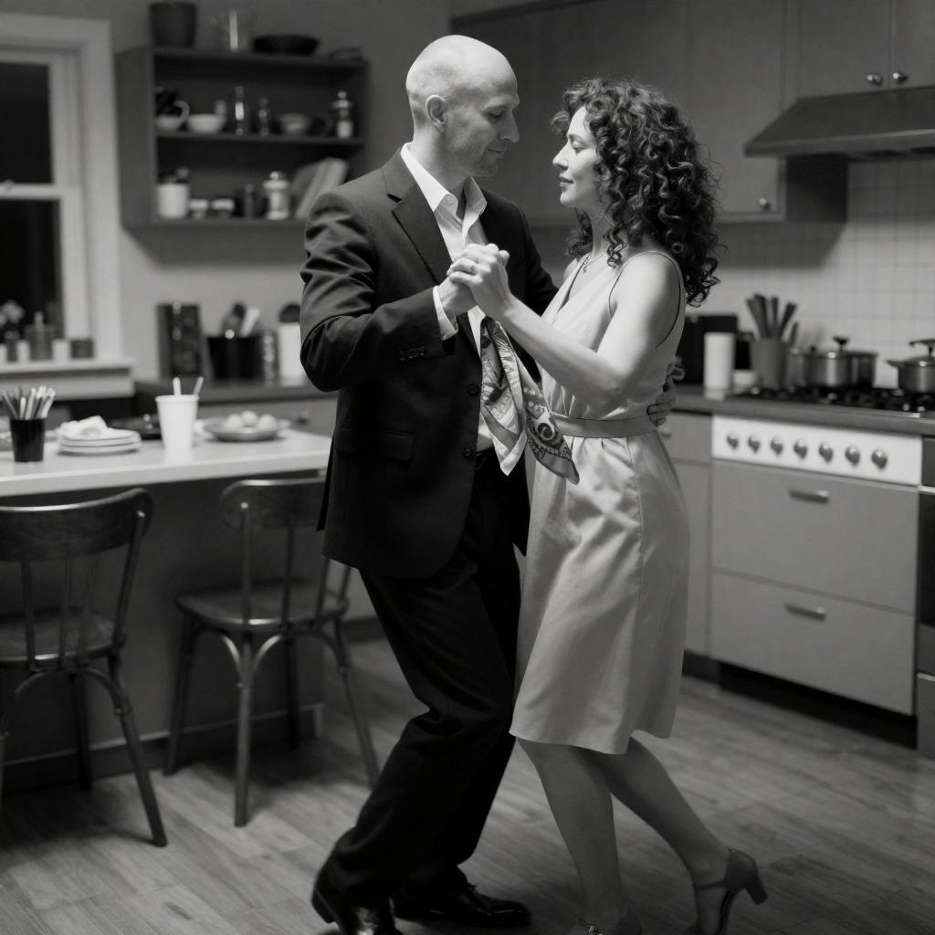 Black-and-white photograph of a bald man in a dark suit and a woman with curly hair in a light dress, dancing in a cluttered kitchen. The man holds the woman's hand, and she holds a patterned scarf. Kitchen counters and chairs are visible in the background.