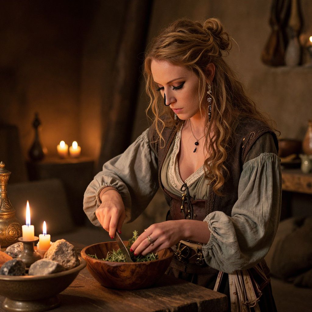 In a cozy, rustic setting, a woman with a heavy eyeliner and a Roman nose, sporting a dirty blonde loose messy bun, is engaged in the art of alchemy. She is dressed in casual pirate clothes, with a green and brown blouse, and is chopping herbs in a wooden bowl. Nearby, a bowl filled with rocks and candles, casting a warm, inviting glow, adds to the ambiance. The scene is illuminated by the soft light of the candles, creating a sense of warmth and intimacy. The woman's focused expression and the intricate details of her attire and surroundings suggest a world of fantasy and herbalism, where the blending of potions and the study of herbs are central activities. The overall composition is harmonious, with the objects and their spatial relationships creating a balanced and engaging visual narrative.