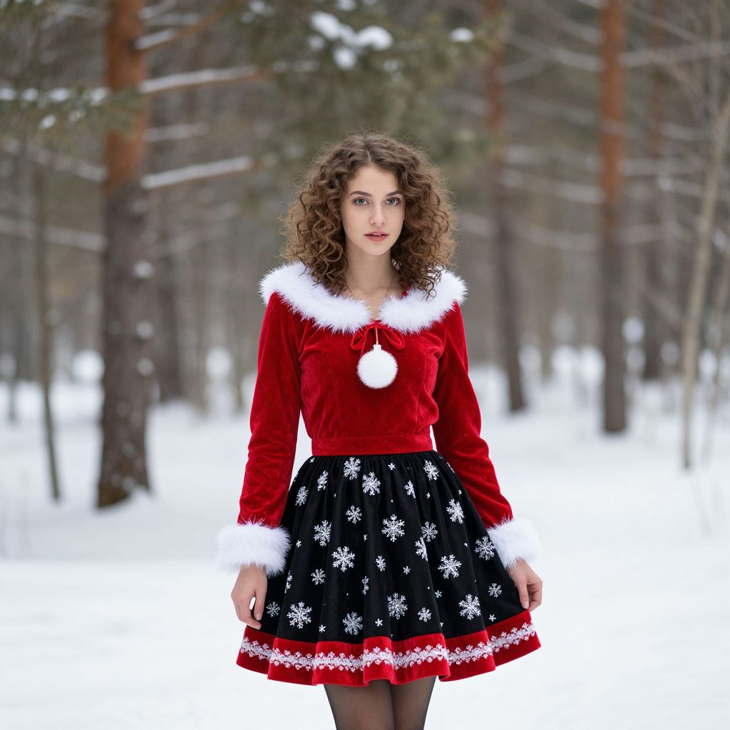 Photograph of a young woman with curly brown hair standing in a snowy forest. She's wearing a festive red velvet top with white fur trim and a black skirt adorned with white snowflake patterns and red trim. She has a small white ornament on her chest. The background features blurred pine trees and a snowy ground, creating a winter wonderland feel.