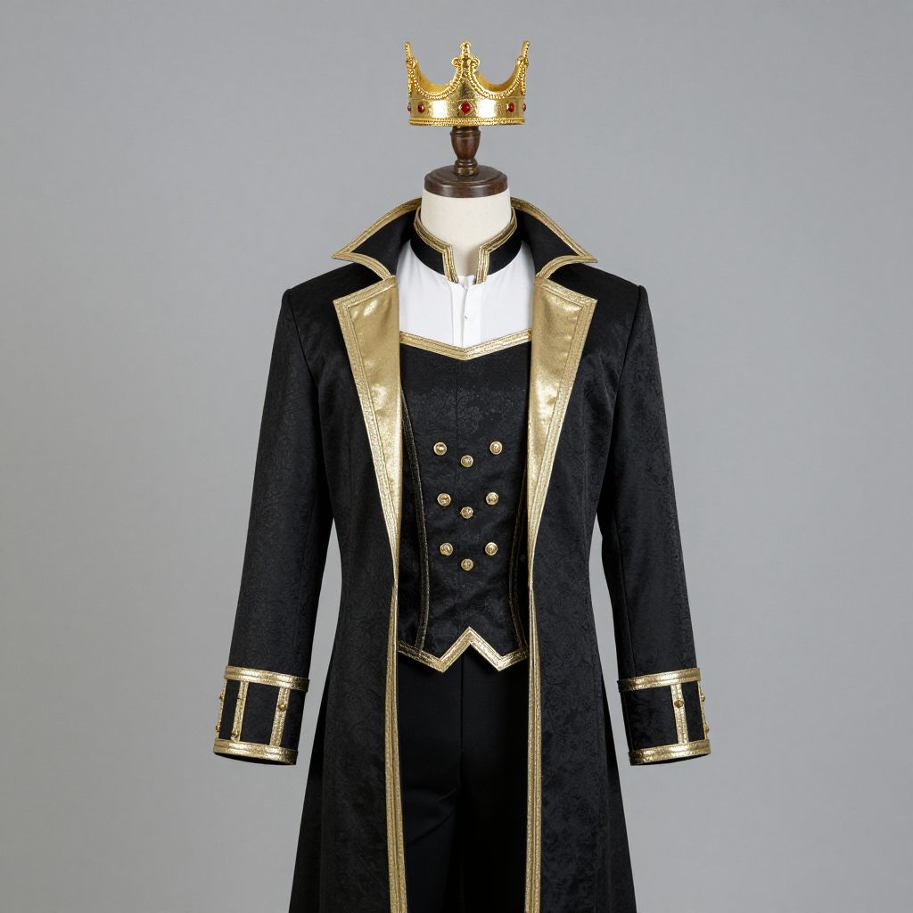 Photograph of a black royal coat with gold trim, double-breasted buttons, and gold accents, displayed on a mannequin wearing a gold crown