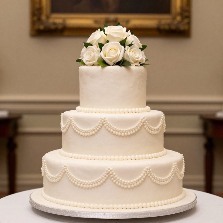 Photograph of a three-tiered, white wedding cake adorned with intricate pearl bead detailing along the edges of each tier. The top tier is crowned with a bouquet of white roses with green leaves. The cake sits on a silver cake board, and the background features a blurred, classical painting in a golden frame on a beige wall, with dark wooden furniture in the lower background. The cake's smooth, fondant texture contrasts with the delicate, beaded embellishments. The overall style is elegant and sophisticated, emphasizing simplicity and luxury.