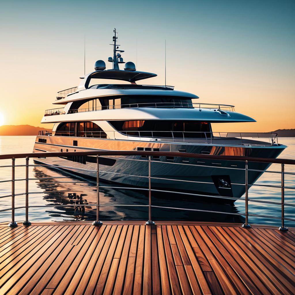 Sleek luxury yacht with gleaming chrome railings and polished wood deck, anchored on calm sea during vivid sunset. The yacht features modern design with multiple decks and navigation equipment visible on top. The warm light reflects beautifully on the water and the vessel's surface.