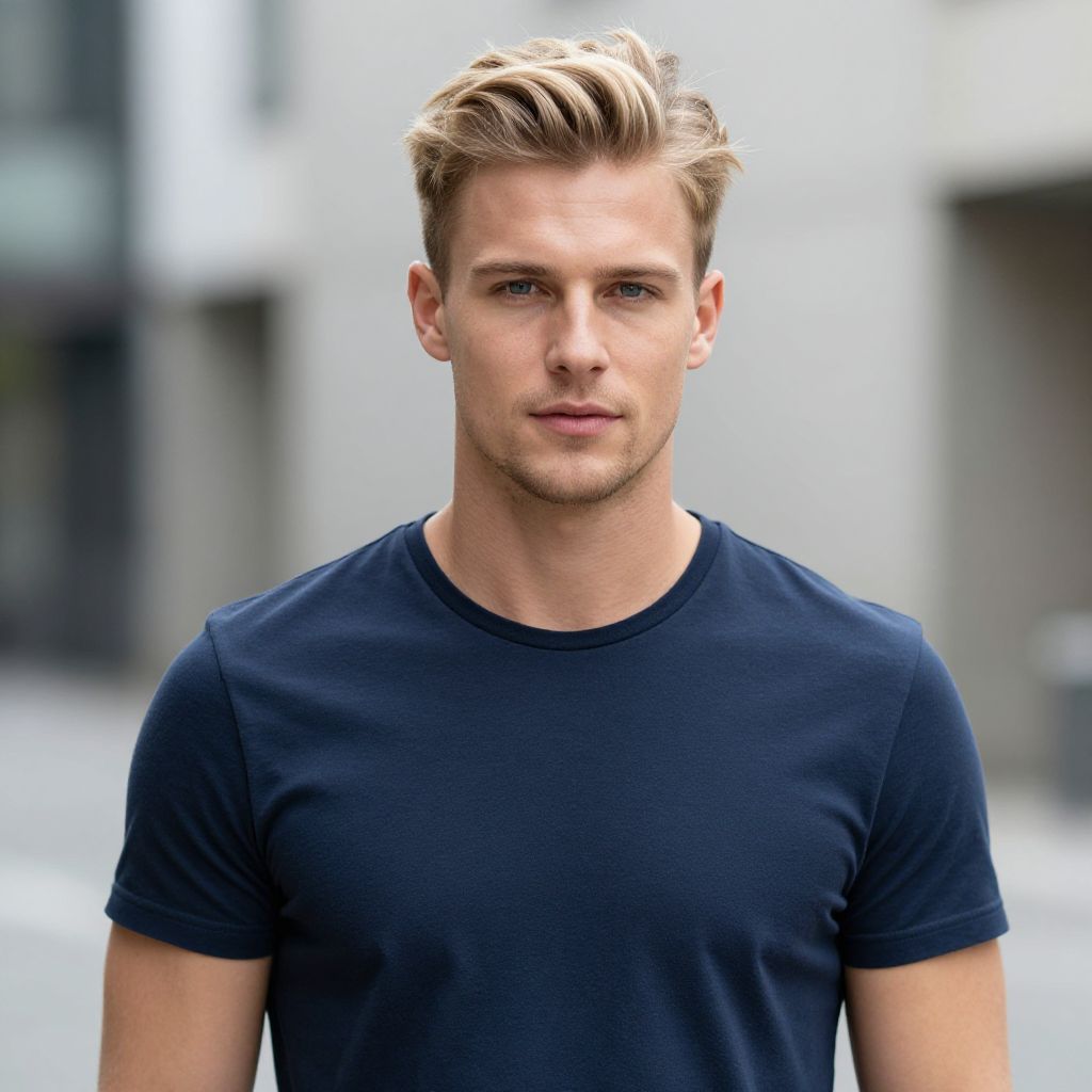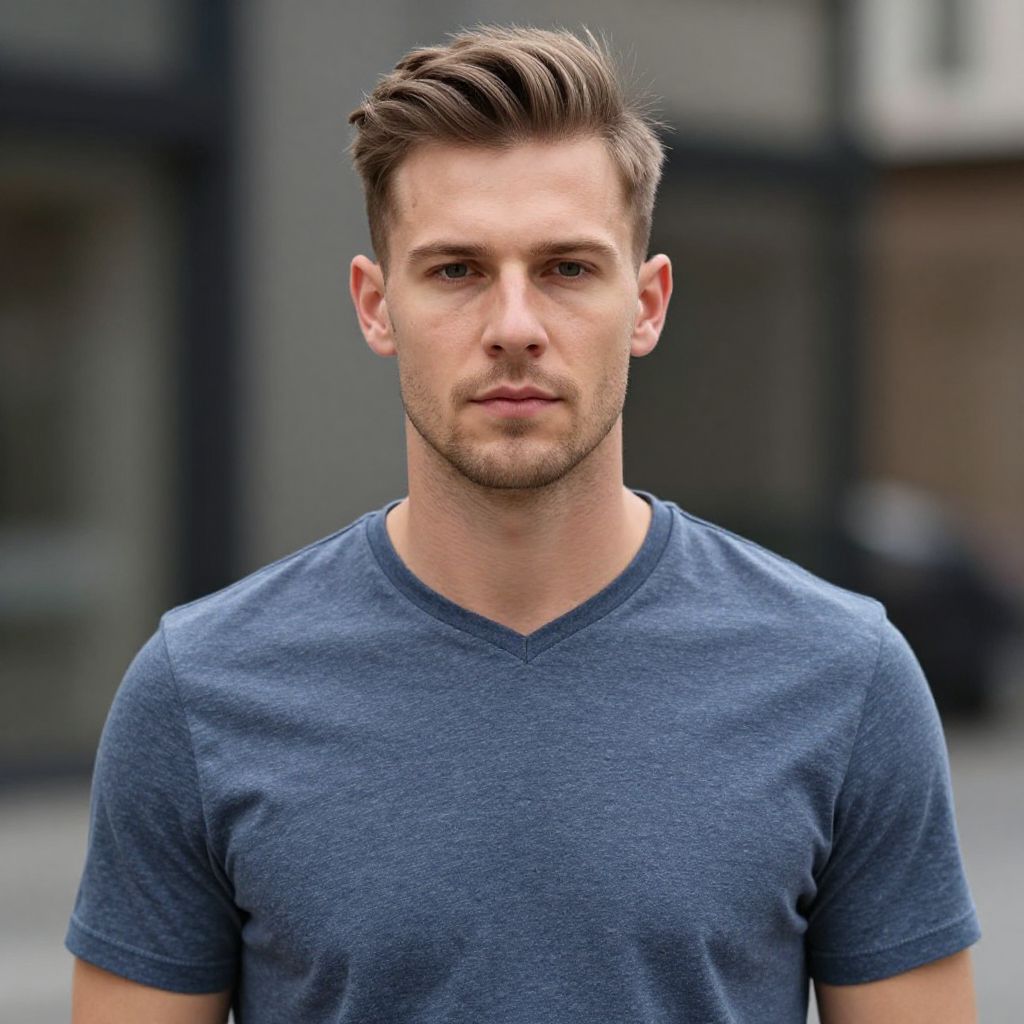 "baggy shirt style costume, 1boy, male focus, solo, shirt, hands in pockets, watch, blonde hair, blurry, blurry background, facial hair, outdoors, wristwatch, sleeves rolled up, pants, realistic, looking at viewer, short hair, collared shirt, closed mouth, belt Realistic photo of casual sexy person with pretty face"