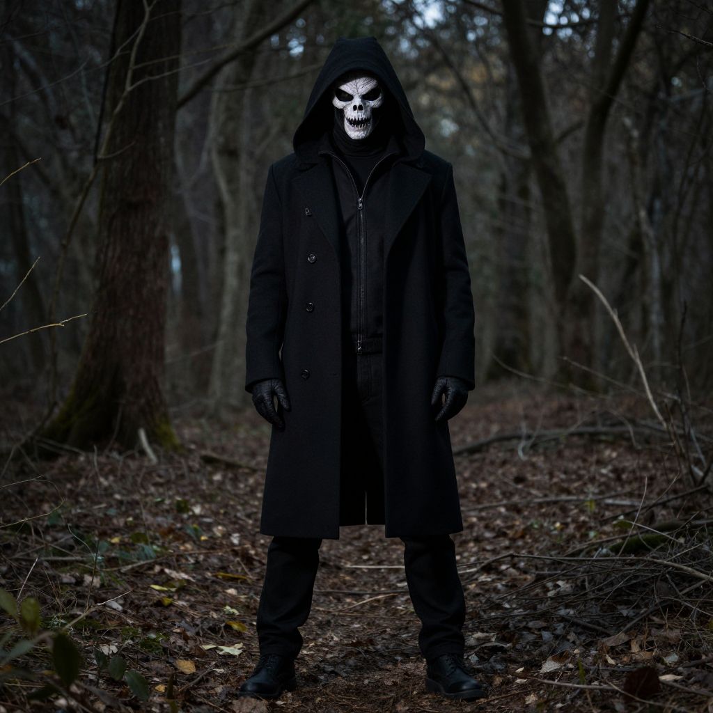 Photograph of a mysterious figure standing in a dark, forested path. The person, dressed in a long, black, hooded coat and black gloves, has a white, skull-like mask with empty eye sockets and a grim, toothy grin. Their hands are clenched at their sides, and they wear black boots. The forest background is dimly lit, with bare trees and a ground covered in dried leaves and twigs. The overall atmosphere is eerie and foreboding, with deep shadows and a moody, blue-gray color palette. The figure's menacing appearance contrasts sharply with the natural, muted tones of the forest.