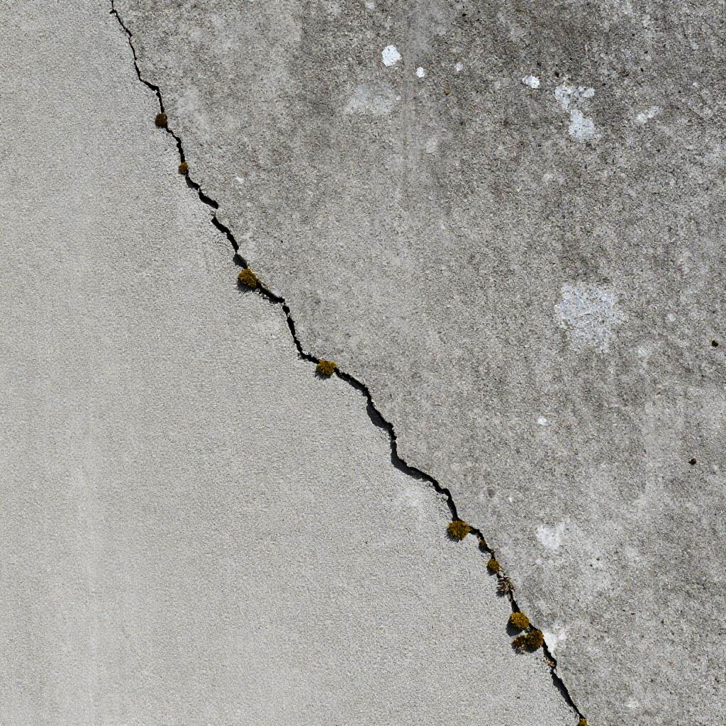 Close-up of a raw betonwand showing cracks, weathered texture, moss growing in crevices, industrial background, natural lighting highlighting the ruggedness, photorealistic, monochrome tones