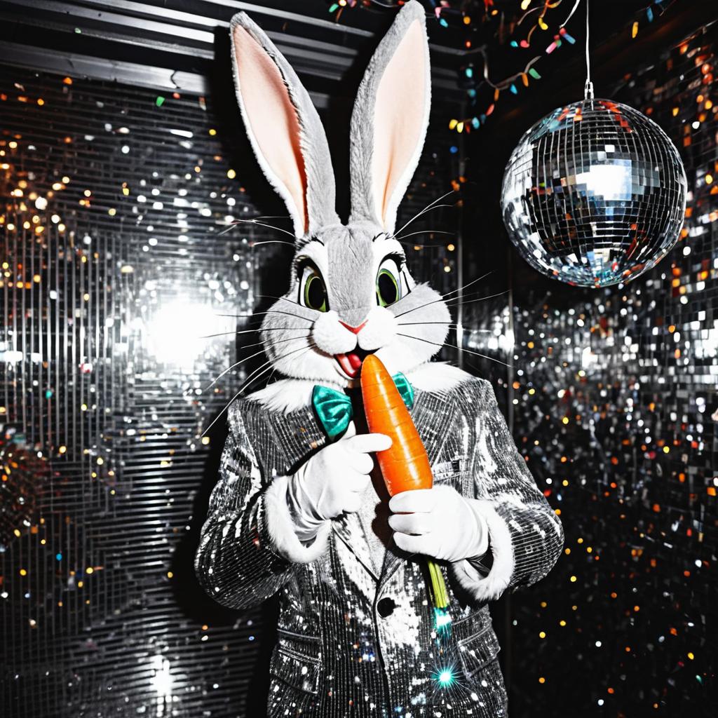 Human Bugs Bunny funky disco style, glossy fur and large expressive eyes and glittery jumpsuit, also eating a carrot, disco ball decor
