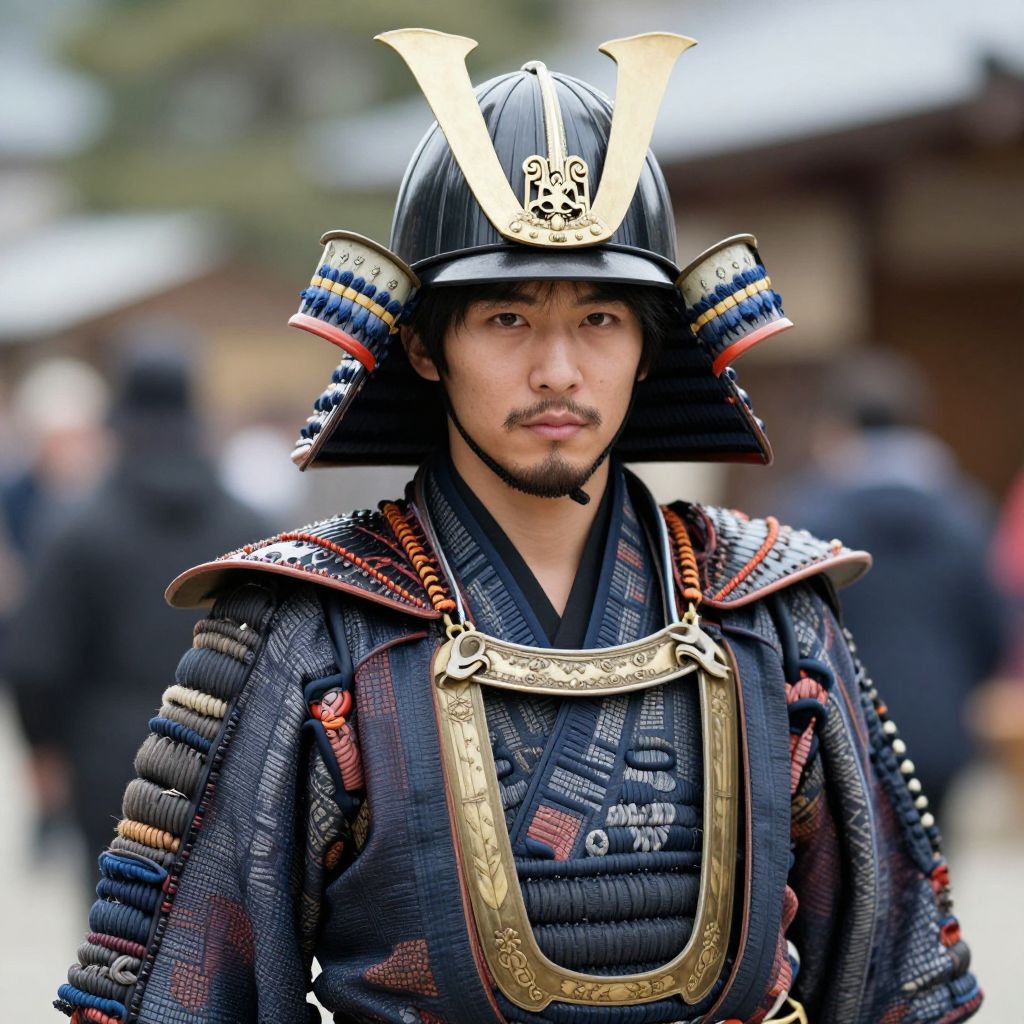Photograph of a serious Japanese samurai in traditional armor with intricate patterns, black helmet with gold "V" emblem, and detailed chest plate, standing