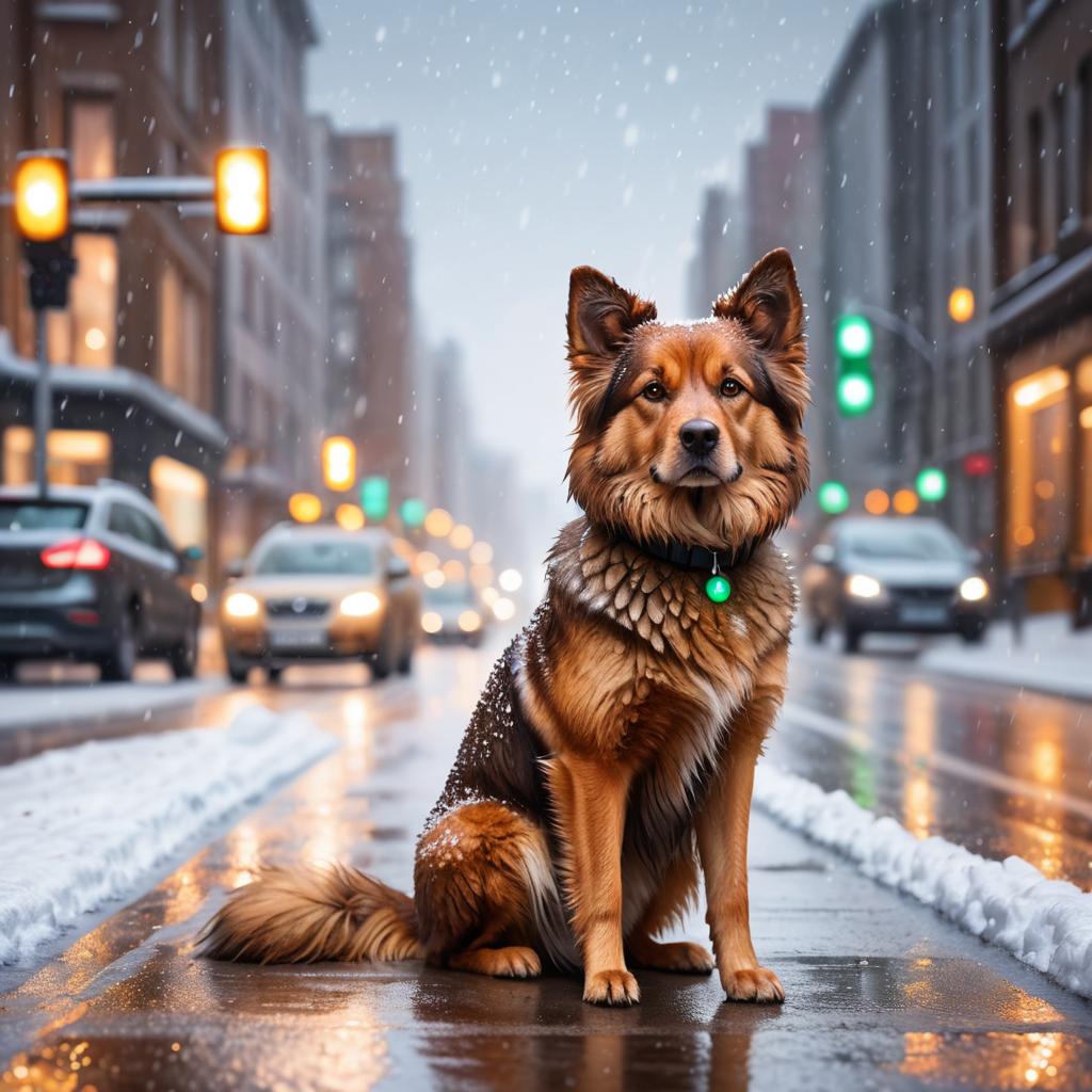 A realistic detailed image of a fluffy brown dog sitting on a snowy city street during winter, urban background with blurred traffic lights and cars, wet road reflecting lights, natural lighting highlighting the dog's fur texture, warm brown color tones on the dog contrasting with cold snow and city environment