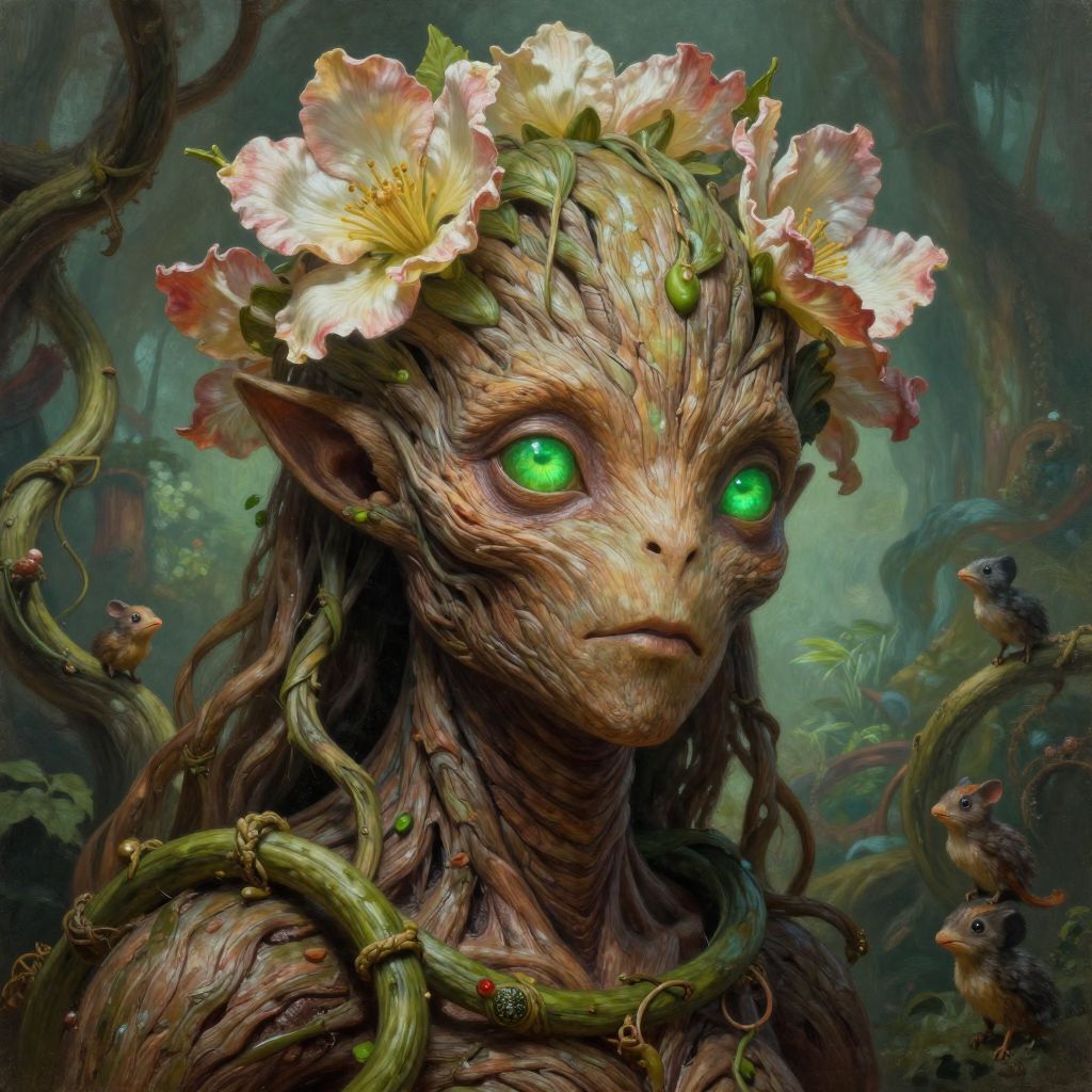Close-up of a plant humanoid with bark-like skin and blooming petals instead of hair, eyes glowing emerald green, surrounded by twisting vines and small woodland creatures, highly detailed digital painting