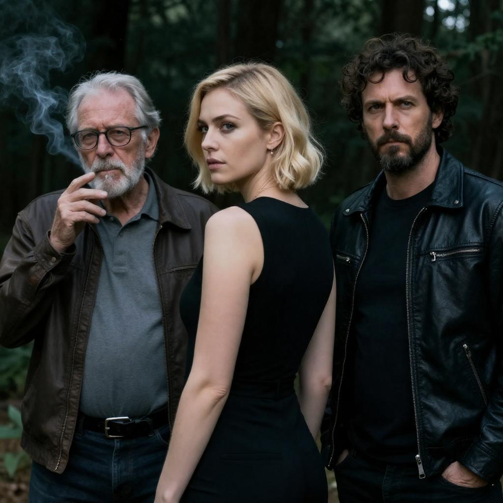 Three individuals walking side by side in a stadium corridor. A woman with long brown hair wearing a brown leather jacket, black blouse, black pants, and white sneakers carries a black handbag. An older man with white hair and gray beard wears a camouflage jacket and dark pants. A younger man with short gray hair is dressed in a plaid shirt and dark pants with white sneakers. The background shows empty stadium seating and a green wall under roofed walkways.