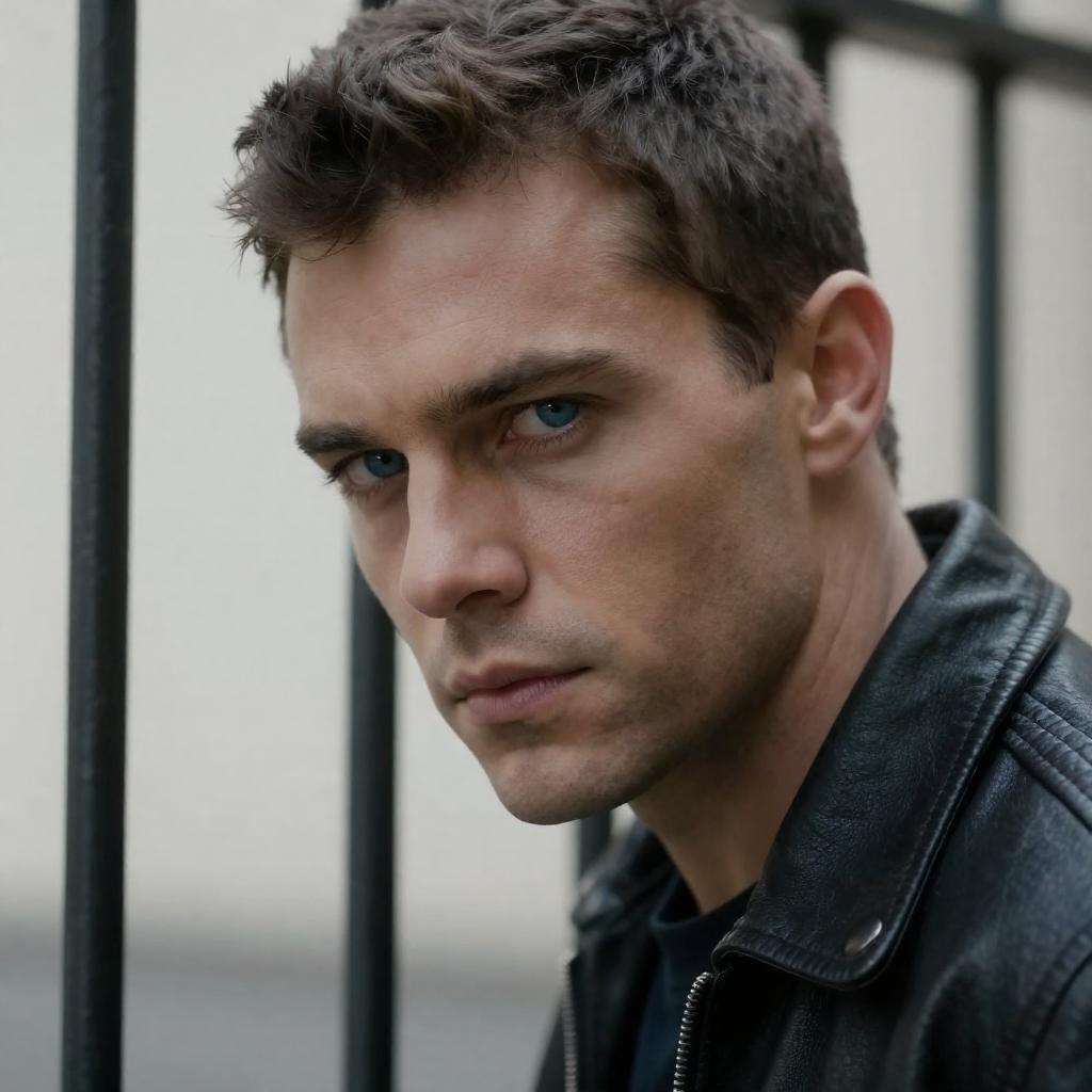 Close-up photograph of a light-skinned man with short dark hair and striking blue eyes, wearing a black leather jacket. He is leaning against black metal bars, looking determined and serious. The background is blurred, emphasizing the subject's facial expression and features.