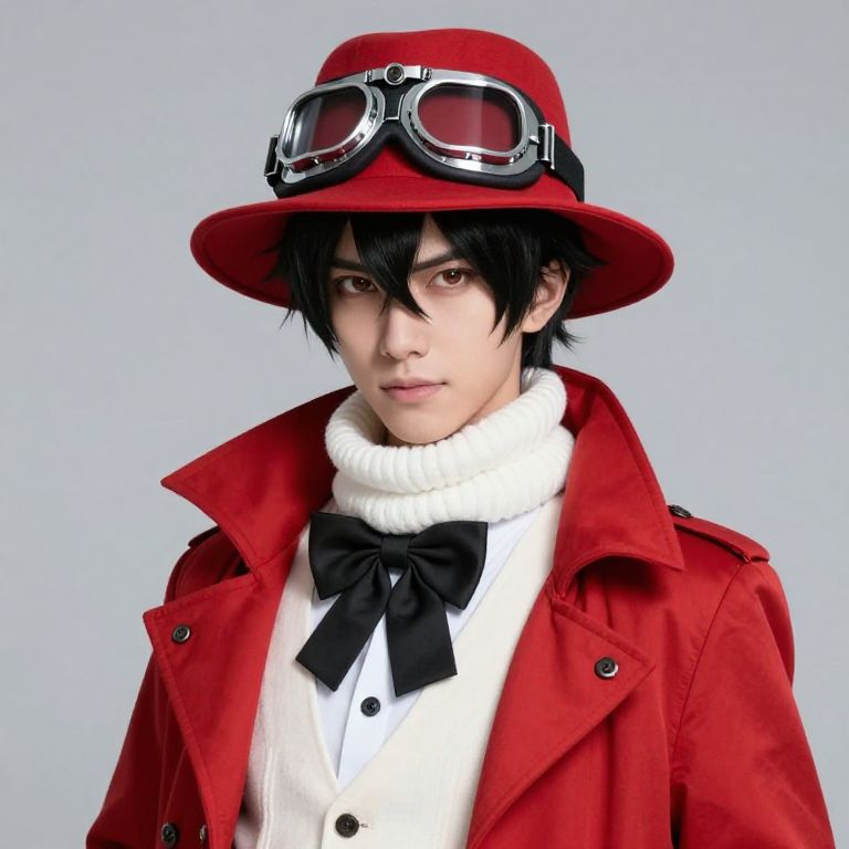 Male with black hair and a red hat with a pair of goggles on top of his head. He is wearing a red coat with a white scarf and a black bow tie.