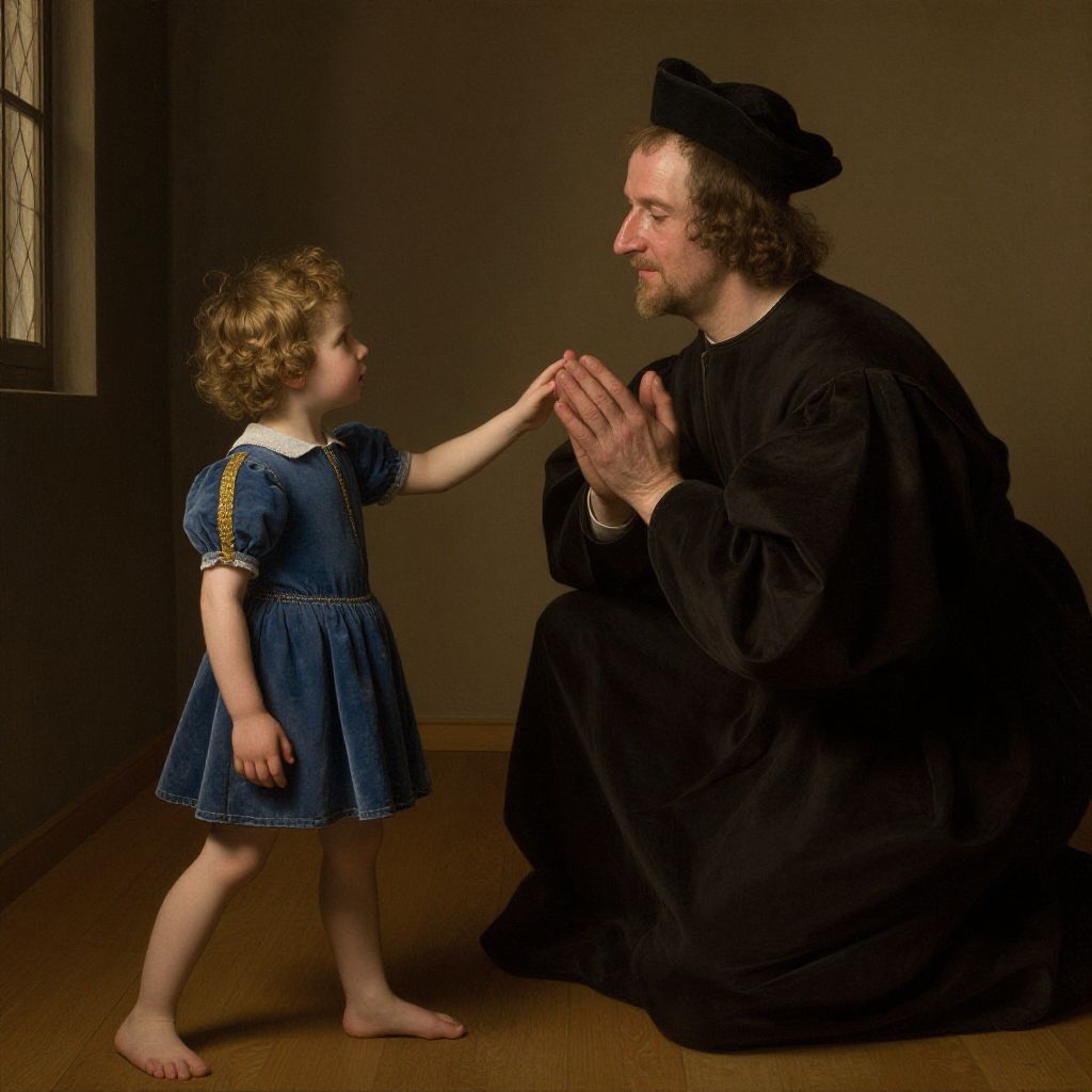 A photograph depicts a young girl with curly blonde hair in a blue dress with white collar and gold trim, standing barefoot on wooden floor and touching hands with a bearded man kneeling in black, Renaissance-style attire and hat. The man, with fair skin and curly brown hair, looks at the girl with a gentle expression. They are in a dimly lit room with a window on the left casting soft light. The girl's dress contrasts with the man's dark, voluminous robes, emphasizing the historical and formal nature of his attire.