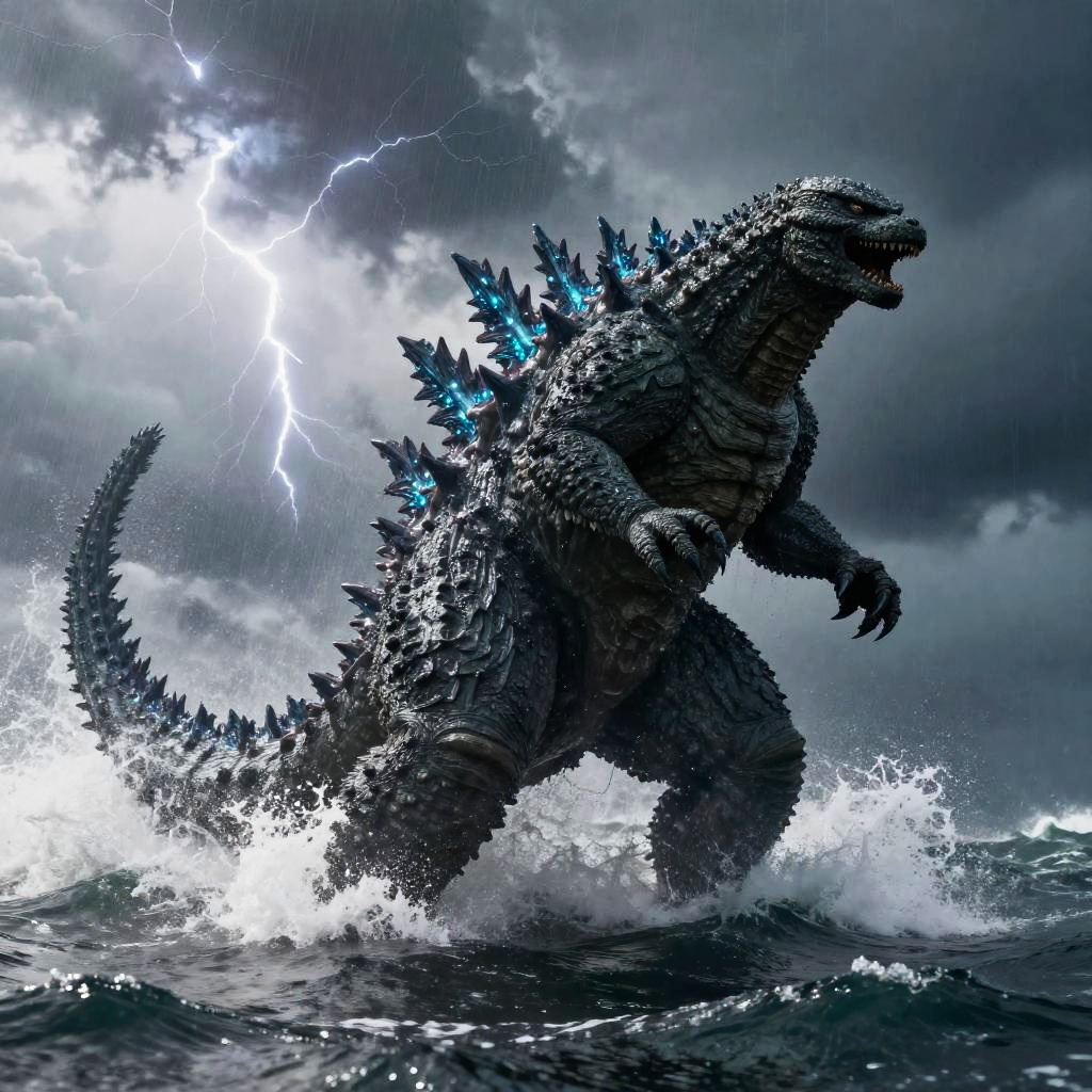 Digital artwork of a giant, textured Godzilla standing on a rocky cliff at sunset, overlooking a stormy ocean with waves crashing below.