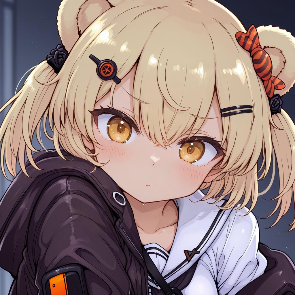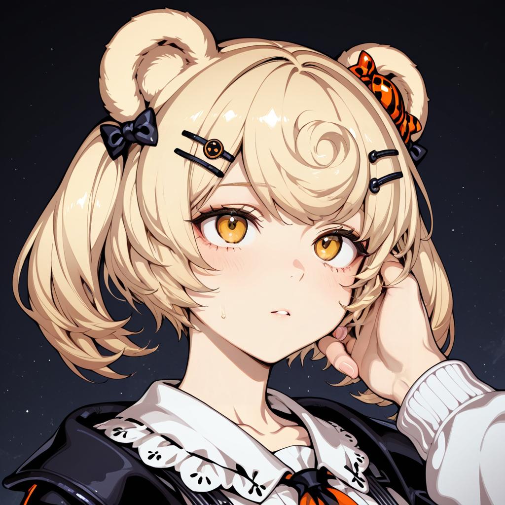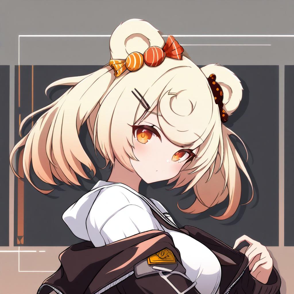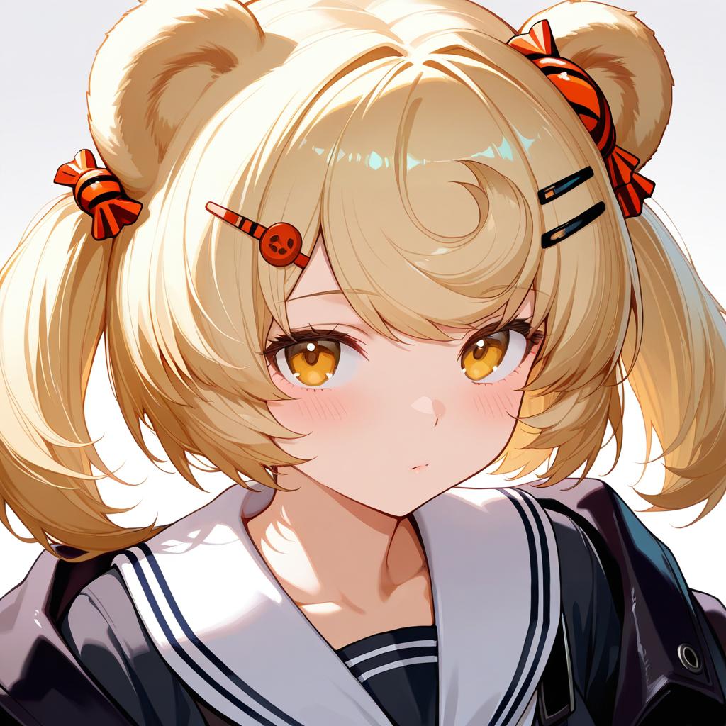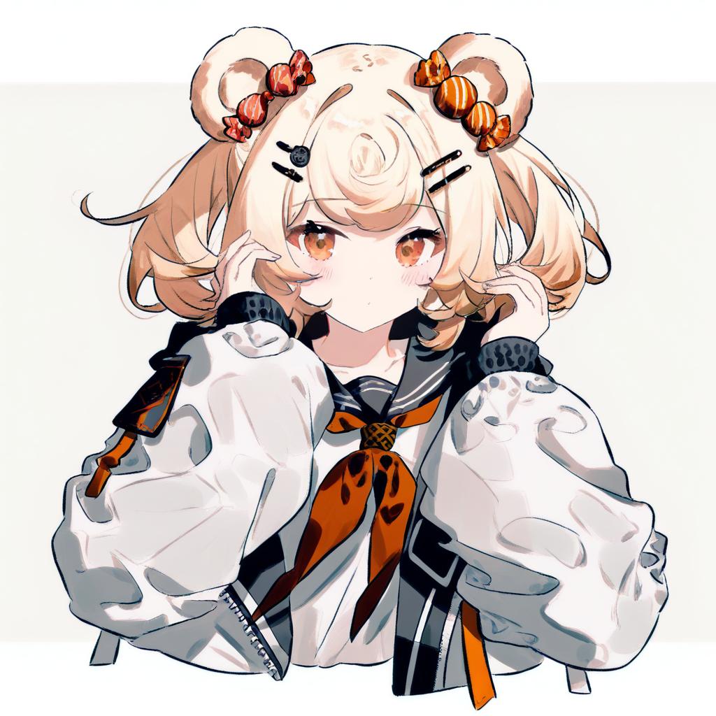 Gummy (arknights), arknights, 1girl, bear ears, orange eyes, red eyes, blonde hair, short hair, candy hair ornament, twintails, hairclip, by artist tokiani, leet