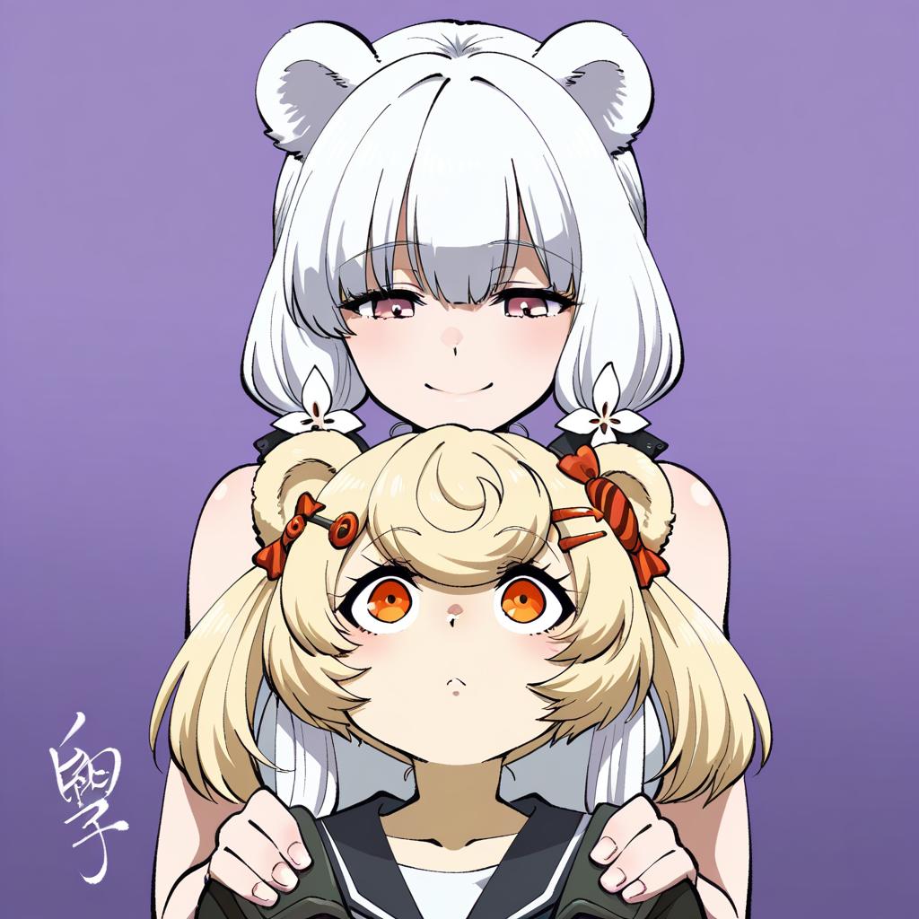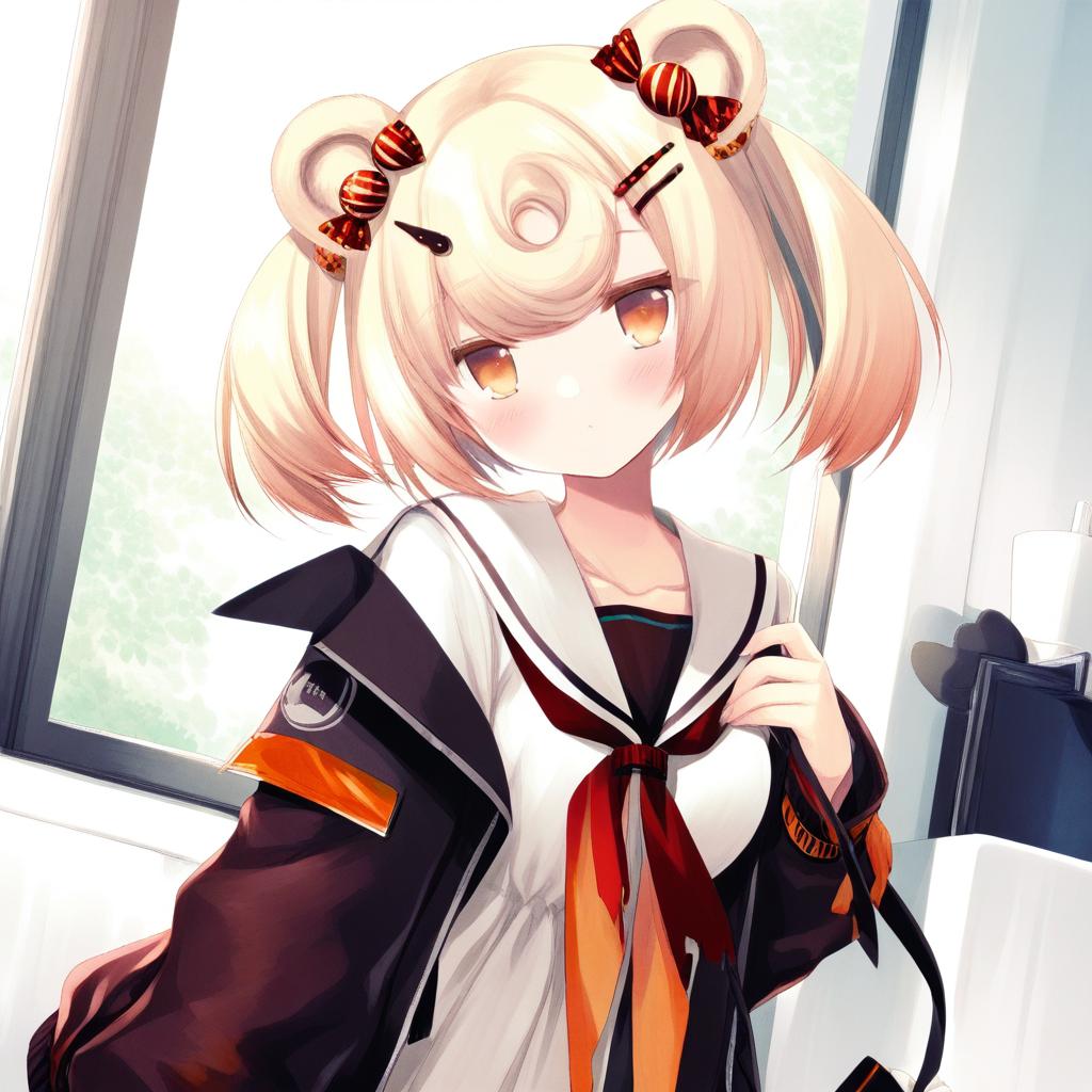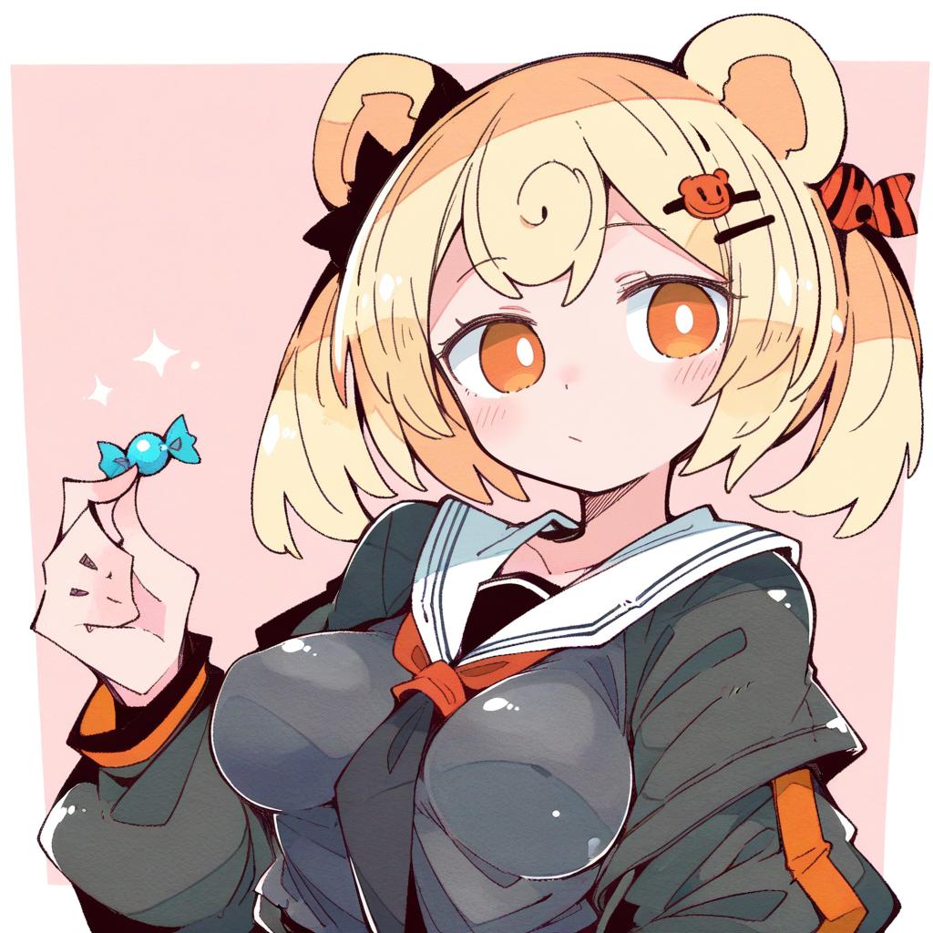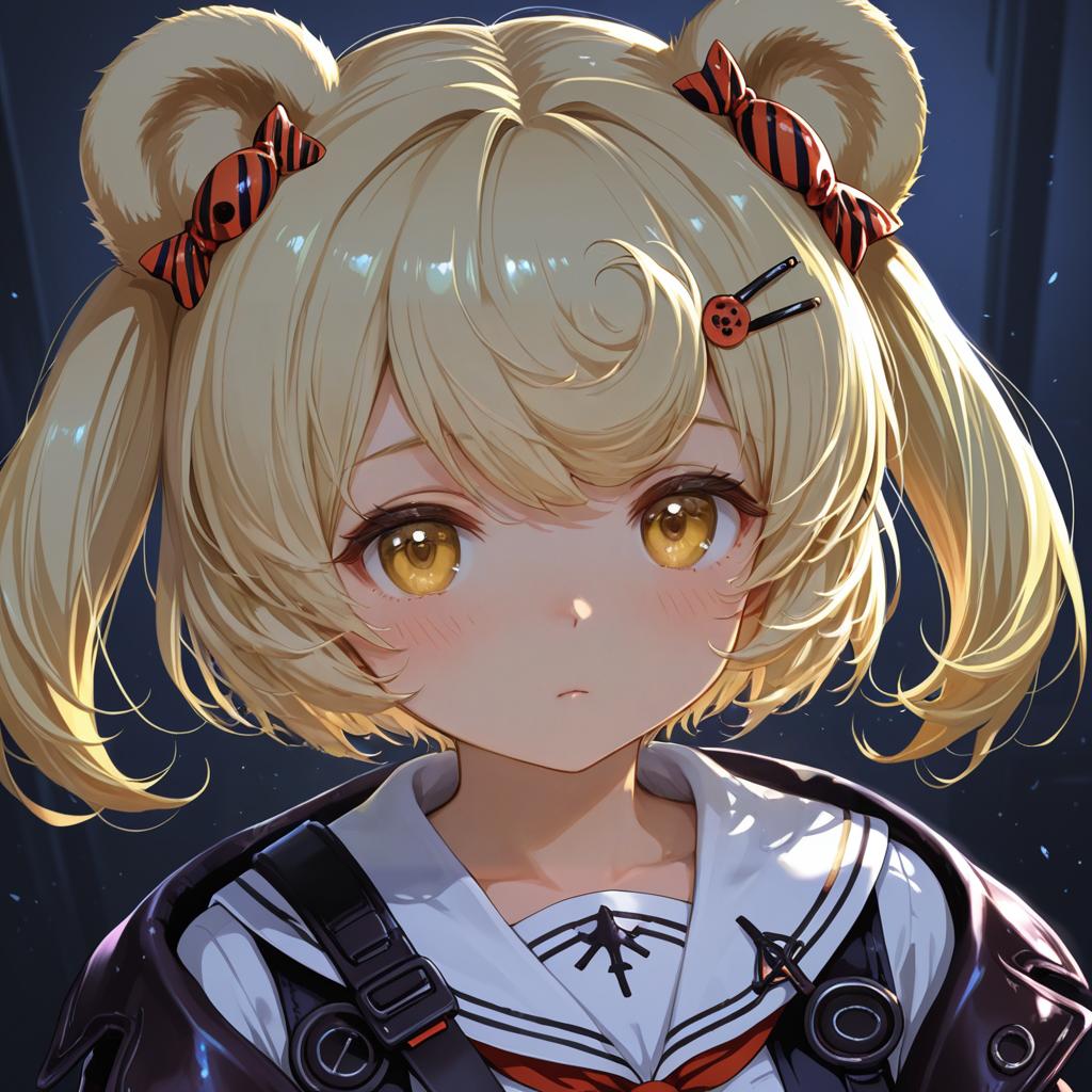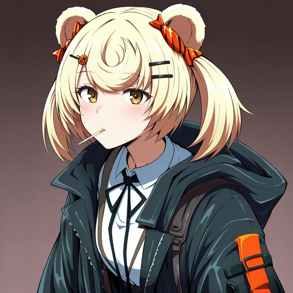 Gummy (arknights), arknights, 1girl, bear ears, orange eyes, red eyes, blonde hair, short hair, candy hair ornament, twintails, hairclip, by artist tokiani, leet