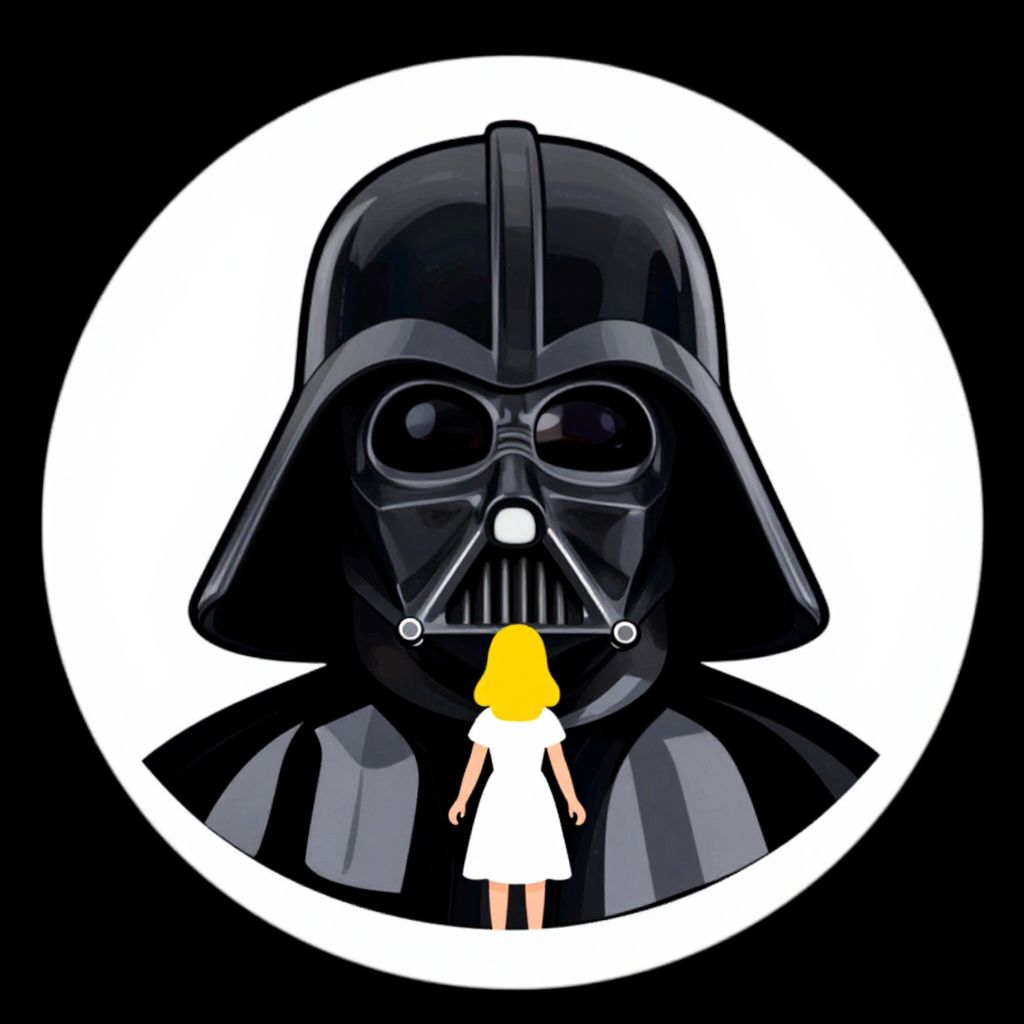 Darth Vader logo, in circle, little angel witch yellow hair, children style, simple, roman one in white dress,