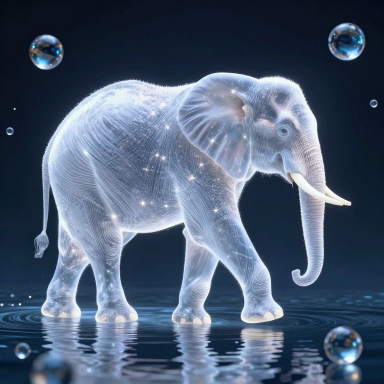 A luminous, translucent elephant composed of cascading starlight strides gracefully across a serene water surface, surrounded by floating spheres that reflect its ethereal form and hint at hidden worlds within.