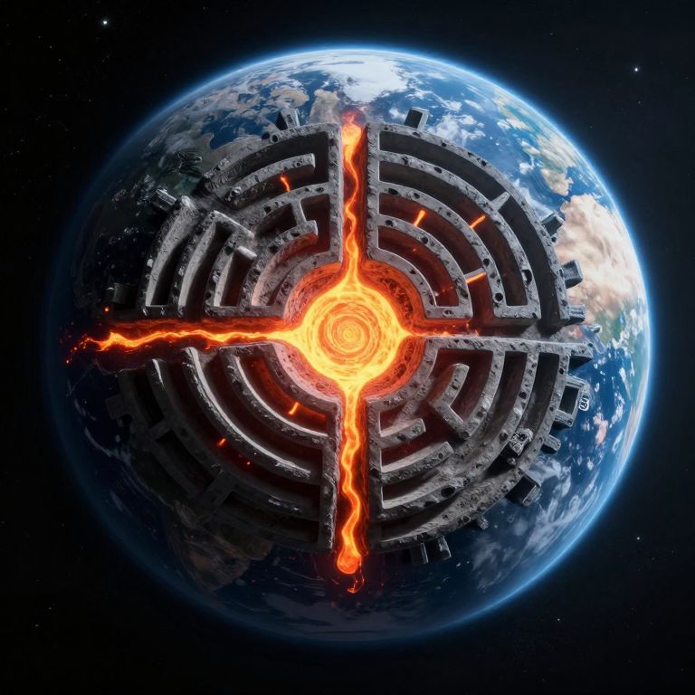 Digital art of a glowing, fiery cross piercing a labyrinthine city on Earth, with blue and white planet against dark space.