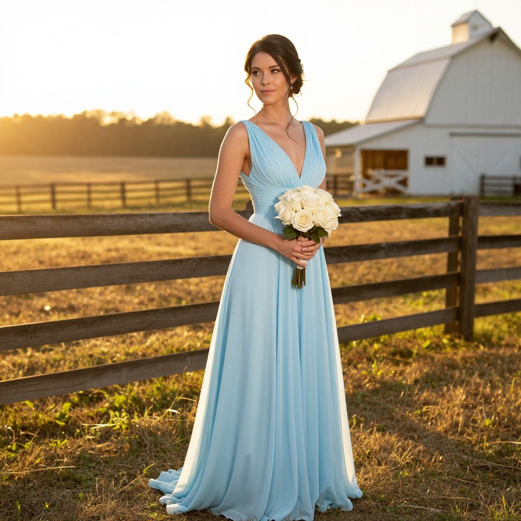 A photograph of a beautiful woman with fair skin and dark brown hair in an updo, wearing a light blue, V-neck, floor-length gown. She holds a bouquet of white roses and stands in a sunlit, rustic field with a wooden fence and a white barn in the background. The golden sunset casts a warm glow over the scene.
