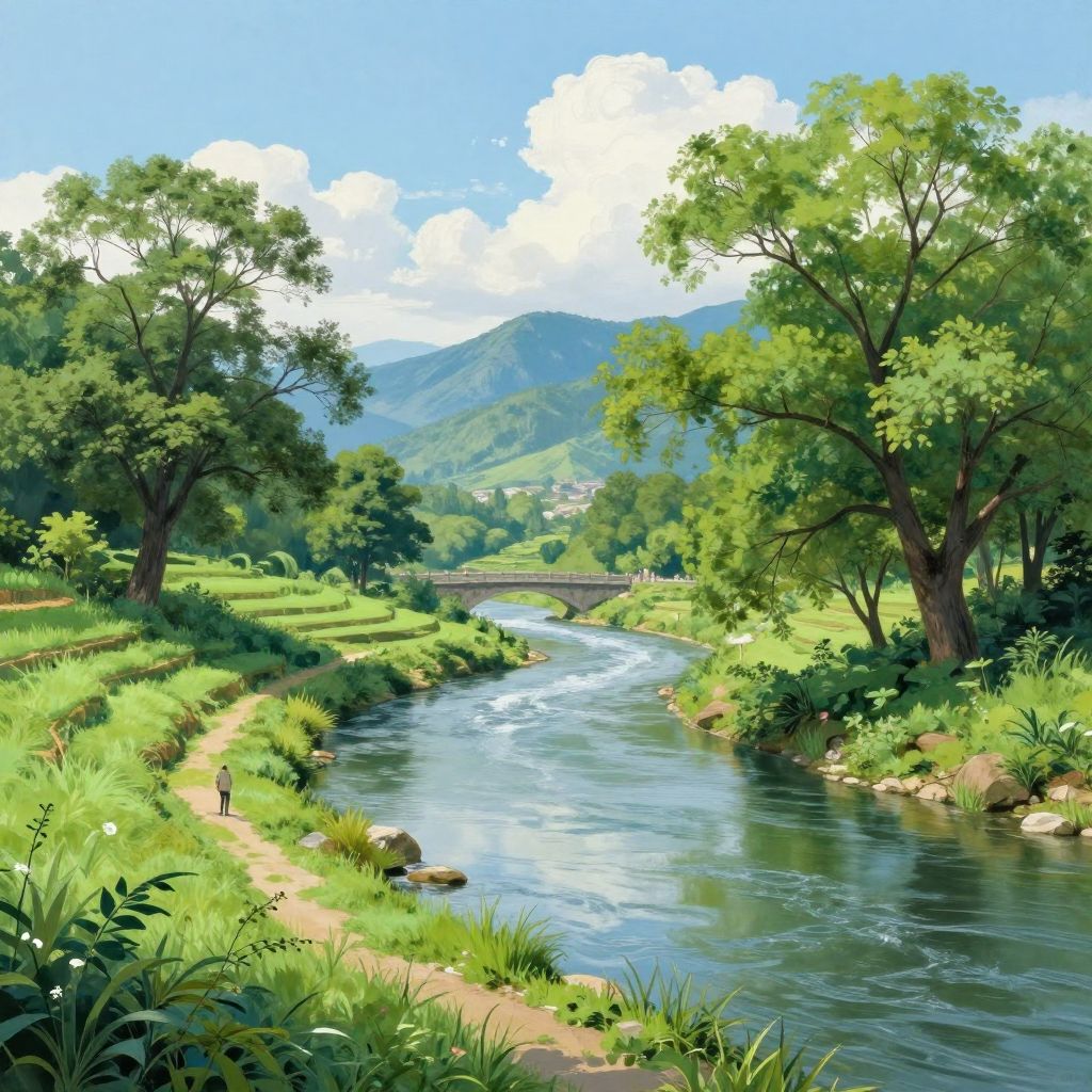 A beautifully detailed painting of a serene river winding through a lush green valley with large trees, terraced grassy banks, and distant mountains under a bright blue sky with white clouds. A stone bridge spans the river in the background, and a single person stands on a path by the riverbank.