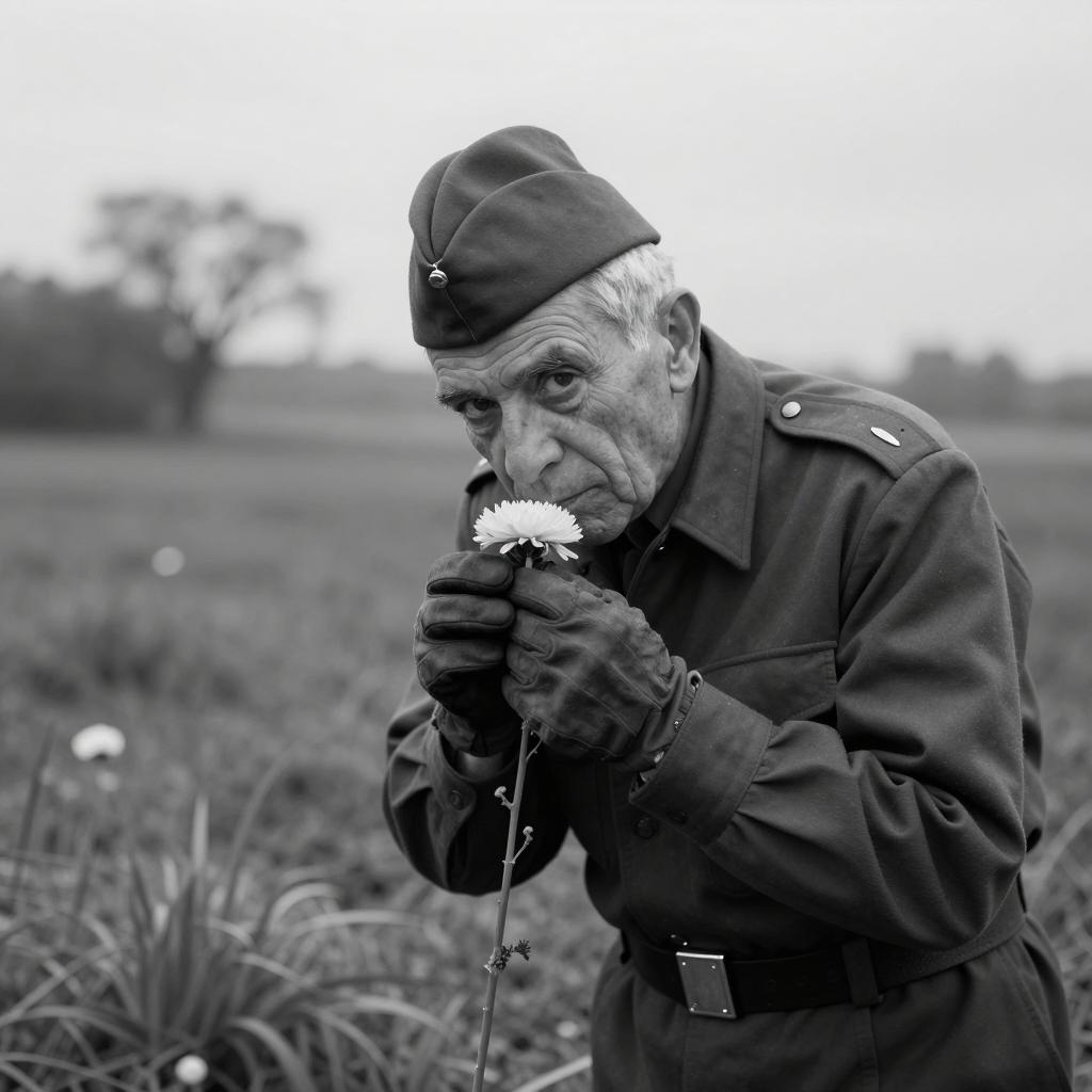 Black-and-white photograph of an older man with a military cap, leaning forward in a grassy field. He wears a dark uniform with gloves, holding a flower to his mouth. Intense, focused expression. Background shows blurred trees and sky.